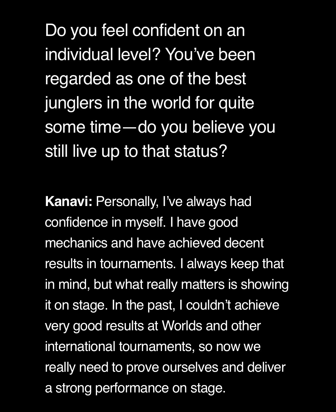 Kanavi:就我个人而言,我一直对自己有信心。在比赛中取得了不错的成成绩。我一直牢记这一点,但真正重要的是在舞台上展示它。过去,我在世界赛和其他国际比赛中都没能取得很好的成绩,所以现在我们真的需要证明自己,并在舞台上表现的更加出色。