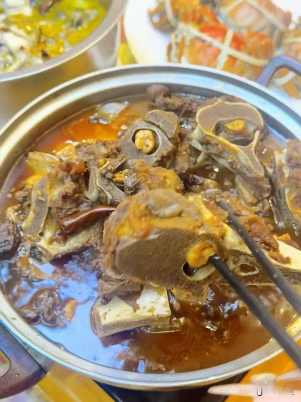 这锅羊蝎子刚端上桌,那股酱香味儿直接裹满鼻子! 筷子夹起一块,骨头上的肉一扯就下来,嫩得浸满了卤汁,咸香里带着点回辣。最绝的是骨缝里那口髓,拿吸管一吸,绵密得像化了的黄油,香得我眯眼睛。 旁边还搭着酸菜鱼和大闸蟹,可我筷子就没离开这锅——天冷吃这热乎的太熨帖,连汤都想泡米饭。 朋友说这馆子是老北京味儿,果然够实在,这一盆啃得我手油嘴亮,走的时候连骨头都想嗦干净!
