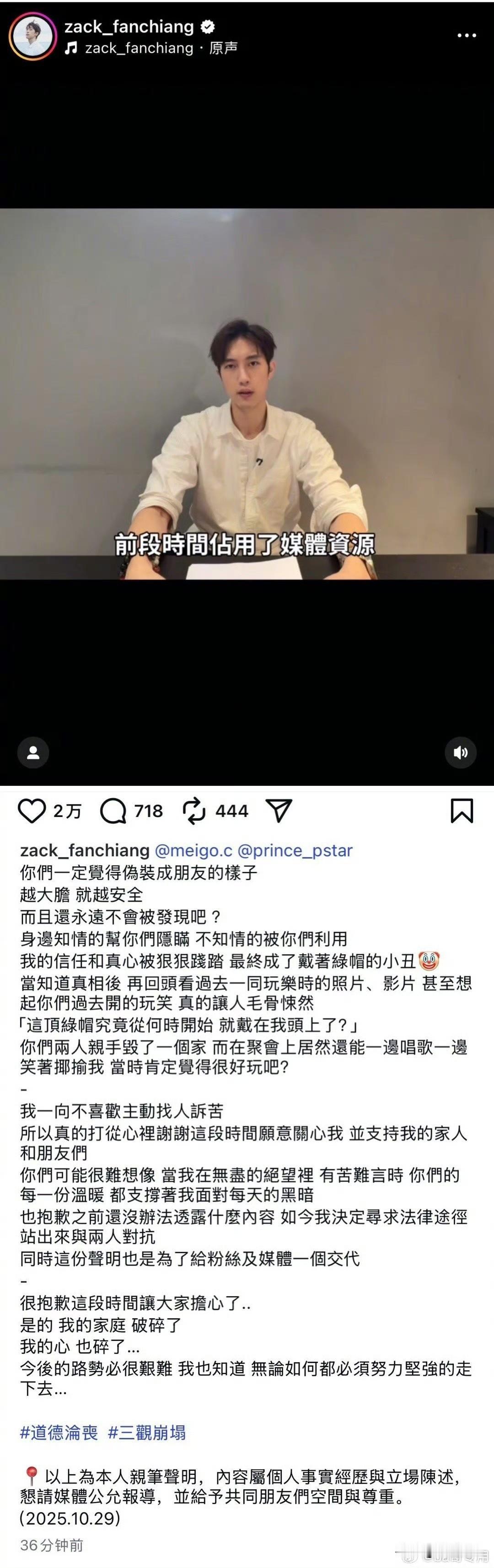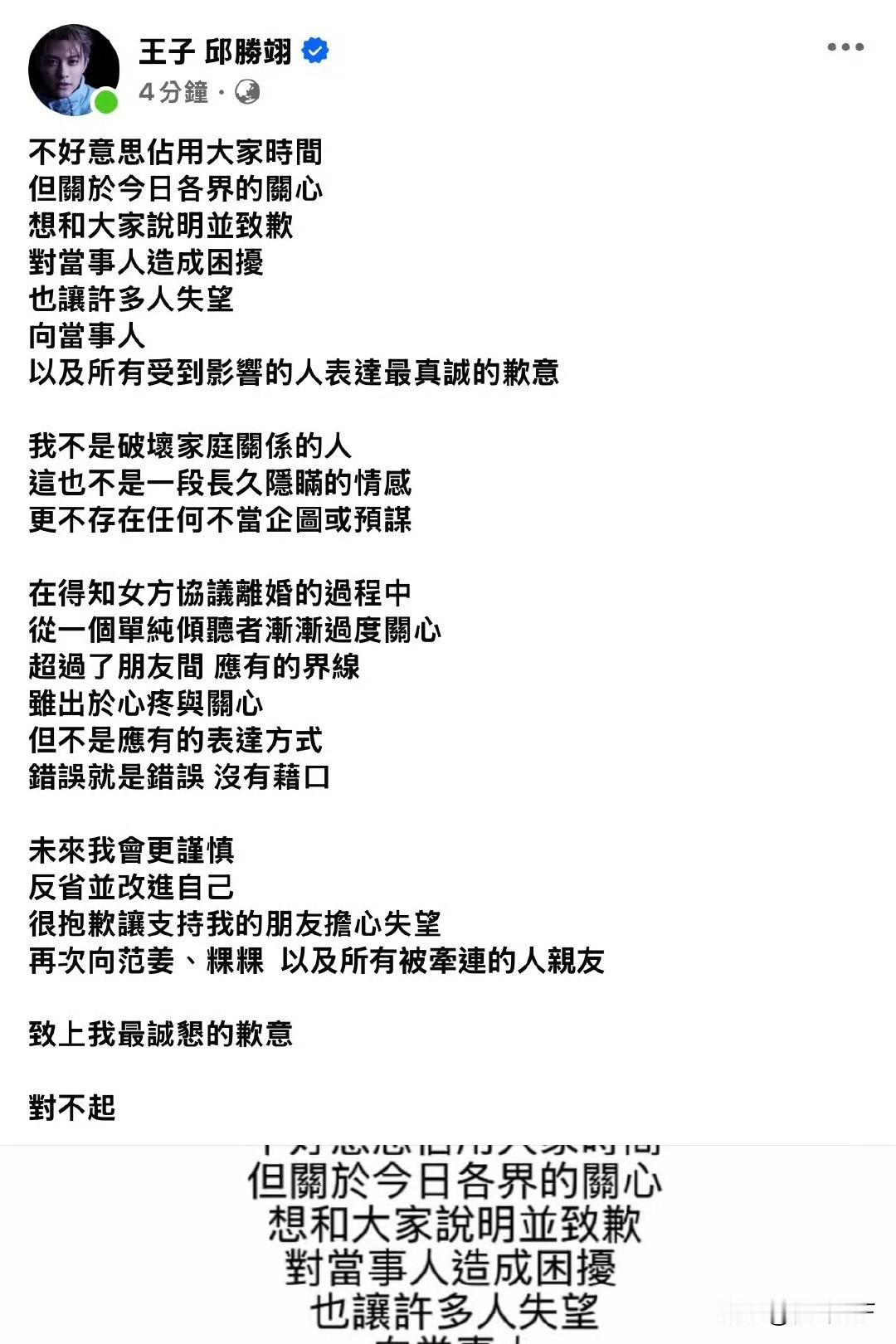 台湾男星范姜彦丰爆料棒棒堂成员王子(邱胜翊)成员插足他和粿粿的婚姻,疑似在说他的妻子婚内出轨。范姜彦丰的妻子回应则是两年在协议离婚中,范姜彦丰爆料很多内容与事实不符,因为他们协议离婚很多事情还没谈拢,她希望双方可以理性沟通。王子发文道歉也表示他不是破坏别人婚姻的人,他只是单纯的关心好友没想到越界了。 总结就是,粿粿和王子是好友,王子不知道粿粿和范姜彦丰正在协议离婚。范姜彦丰想通过“妻子出轨”来为自己争取更多的权益。 希望他们夫妻好聚好散不要利用舆论来伤害他人。