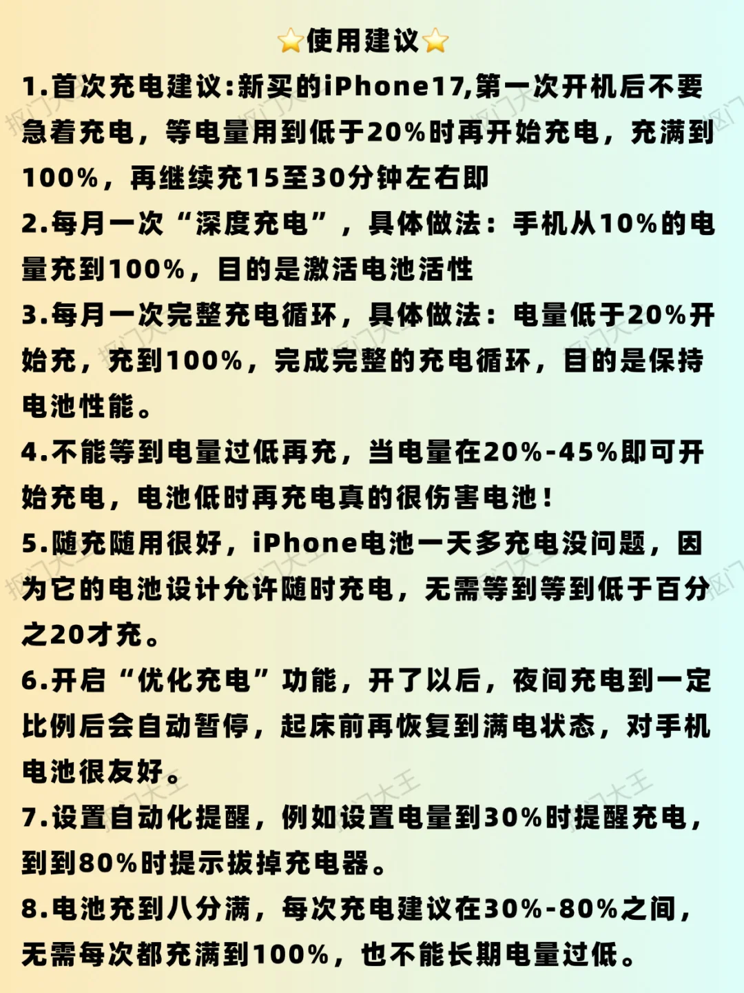 [蹲后续H]宝子们!抠门大王来啦! [喝奶茶R]苹果发售后,大家的手机都陆续到手了吗??开心耍手机的同时,电池保护也要注意!! [哭惹R]抠门之前的15pro只用了11个月,电池健康就掉91%了(哭唧唧),作为过来人,来提醒大家闭坑❗ [哇R]整理了苹果官方的电池保养建议 ⭐p1看使用建议 ⭐p2看不要做伤害电池的行为 ⭐p3保护电池小技巧 [doge]感觉设置起来,让你的iPhone17坚持10年!!!