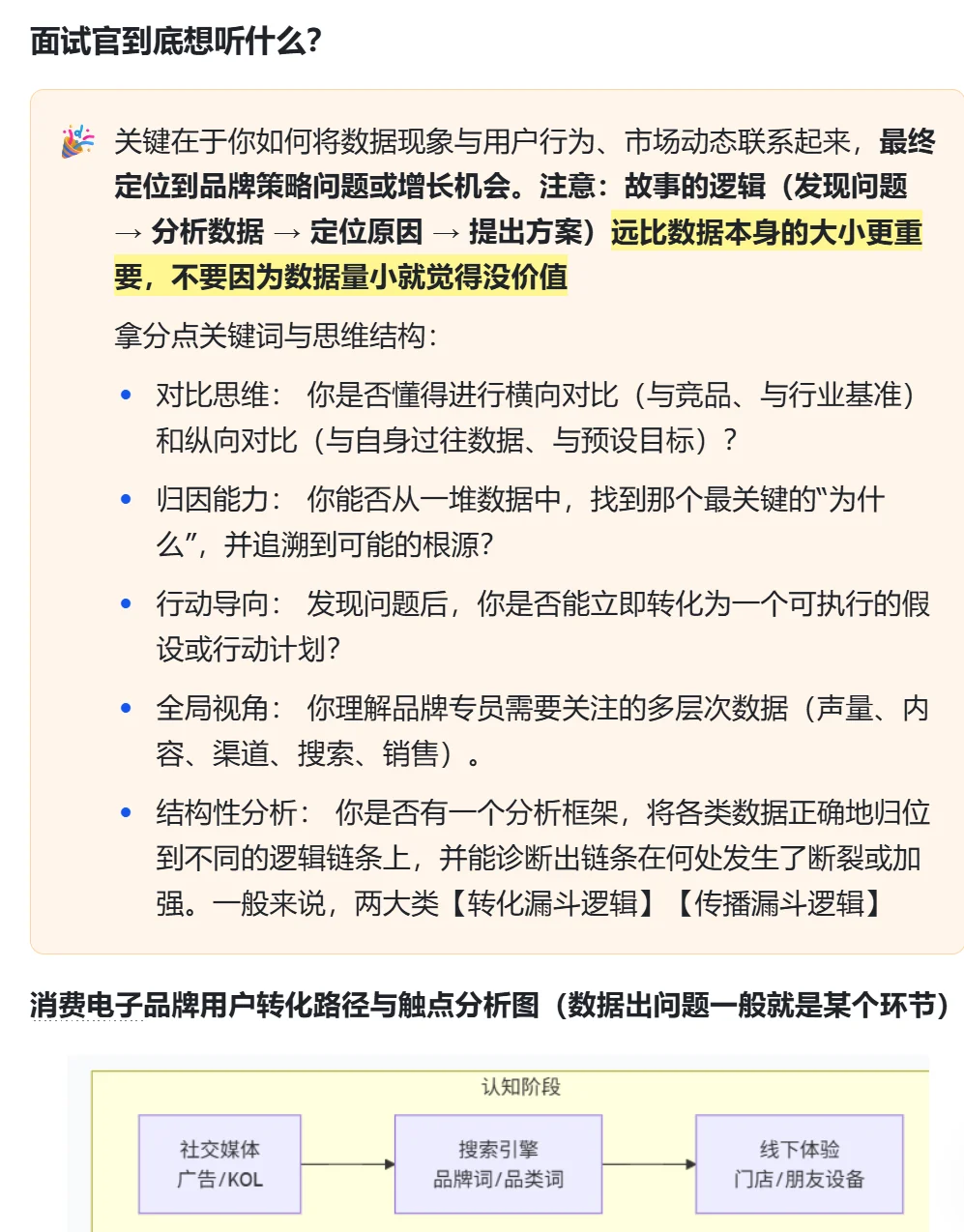 很多学员答这类题,一听到数据两个字就先怯场。怎么解决?记住一个点! 数据只是工具,最终要服务于品牌增长、用户转化、业务优化。
