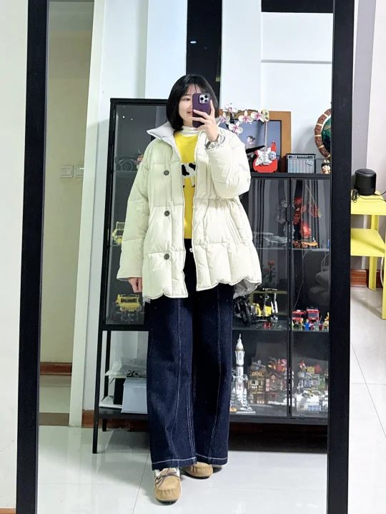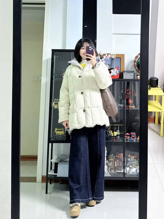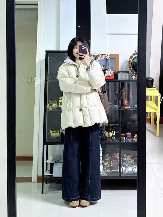 🍂双十一开始准备羽绒服了,拒绝单一的黑灰色,这件两面穿的更合心意,白灰撞色,相当于两个颜色的外套,面料是微微做皱的肌理感,充绒量足够,衣身宽松,简约随性。