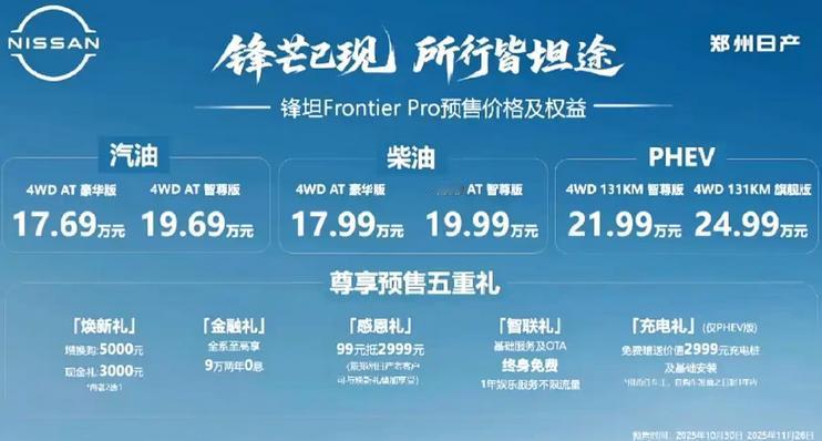 10月30日,郑州日产锋坦Frontier Pro家族正式开启预售,可选汽油版、柴油版和插混动力版本,预售价格区间17.69万-24.99万元。 其中燃油版推出两款配置车型,预售价格区间为17.69万元至19.69万元; 柴油版同样提供两款车型,预售价格区间为17.99万元至19.99万元; 插电混动版则推出两款车型,预售价介于21.99万元至24.99万元之间。 该车型为日产品牌在中国设计、研发、生产并出口全球的皮卡车型。 郑州日产锋坦Frontier Pro汽油版和柴油版的车身长宽高分别为5520/1960/1950毫米,轴距3300毫米,其中货箱长宽高分别为1520/1600/550毫米。 插混版的车身长宽高分别为5494/1960/1950毫米,轴距3300毫米,其中货箱长宽高分别为1520/1600/490毫米。 三种动力版本均可加装后牵引装置,其中插混版最大允许牵引质量达到3300公斤。 动力部分,燃油版车型搭载了2.0T汽油以及2.3T柴油发动机,最大功率分别是258和190马力,峰值扭矩为400和500牛·米,传动系统匹配的是8AT变速箱。 插混版车型则是1.5T+前置单电动机的组合,系统的综合功率320千瓦,综合扭矩800牛·米,传动系统匹配的是4挡DHT变速箱。 新车预计将于今年第四季度正式上市。 点个关注吧!汽节车社,车圈热点资讯每日一扫清!【来自懂车帝车友圈】