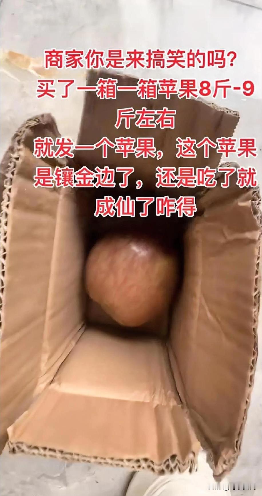 你敢相信网购一箱苹果,商家只给寄过来一个果,你没遇到吧。我也是找我的一箱苹果来,没找到,又打电话给送快递的,快递员说我送过去了,一个小小的箱子,我还说不对呀,应该是个大点的箱子一箱苹果加上箱子应该有10斤左右,快递员说你对对单号,单号是对的,一看箱子一打开懵逼了,俺同事都笑。网上买苹果真的坑,看评论区都是红通通的,等买回来又小又青,还短斤少两,商家说这苹果太阳没晒到,不影响口感。