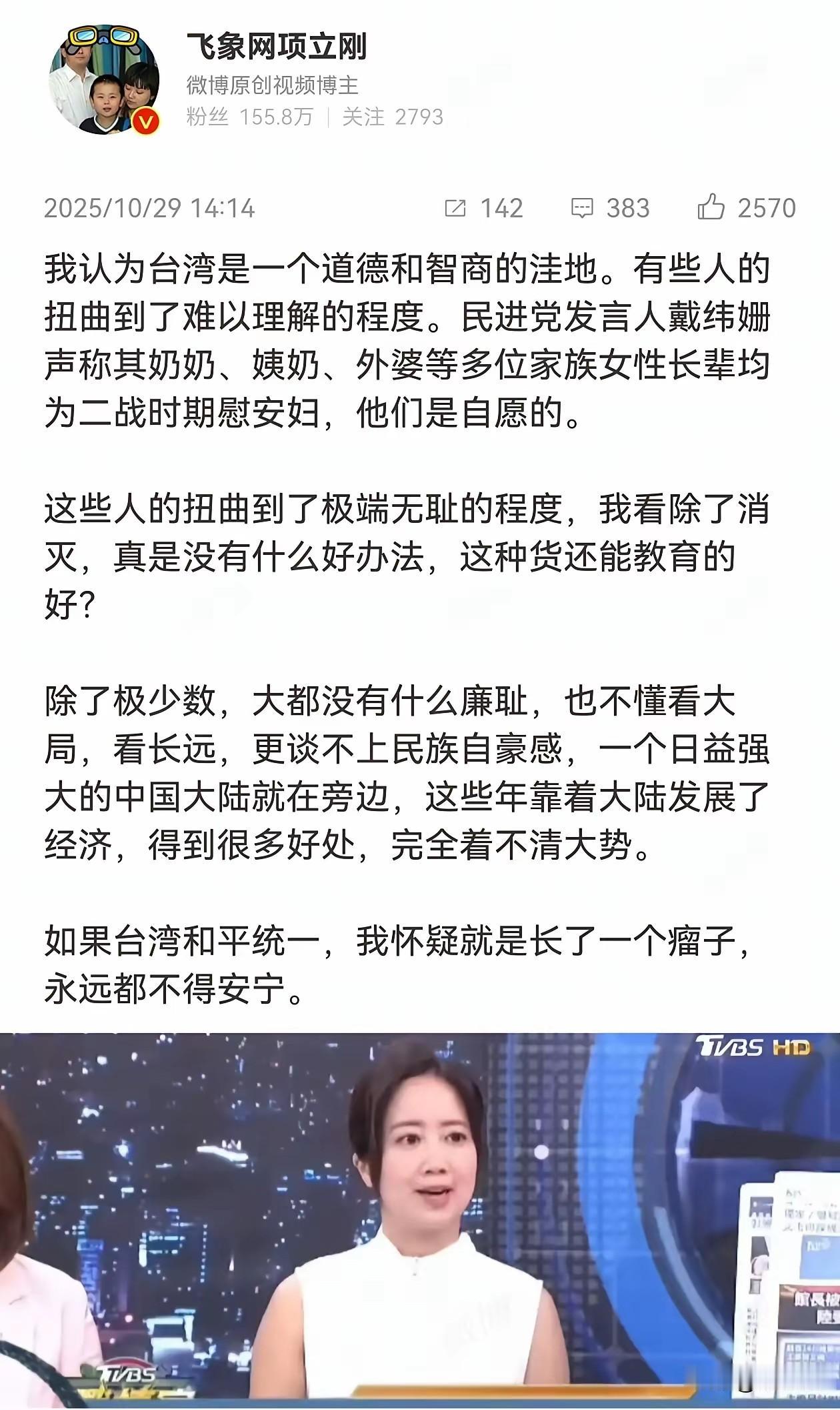 在台湾破岛上黎少康的“少康战情妇”节目里,民进党发言人戴维姗公然说台湾不存在慰安妇,台湾的慰安妇是自愿的,她的奶奶,外婆,姨奶等家族女性都是自愿为日军充当慰安妇,如此一个女性在节目里公开侮辱台湾女性,而台湾人对此却毫不在意无动于衷甚至承认,这样的台湾社会可见已经毫无公义公正公平可言。