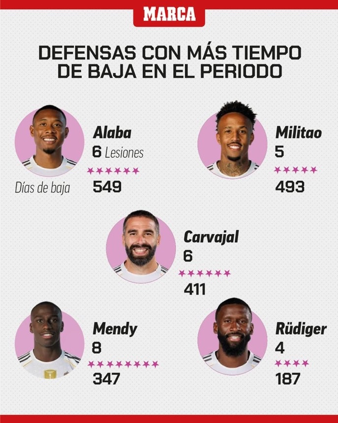 阿拉巴在过去的3个赛季中遭遇了6次伤病,缺席了549天。
