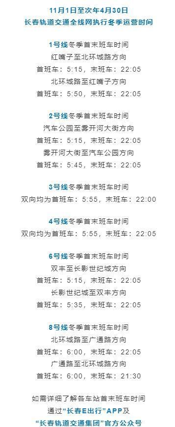 @长春轨道交通 运营时间有变!11月1日至次年4月30日长春轨道交通全线网执行冬季运营时间。具体来看下图: