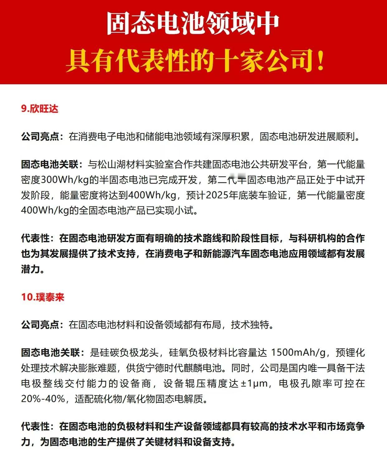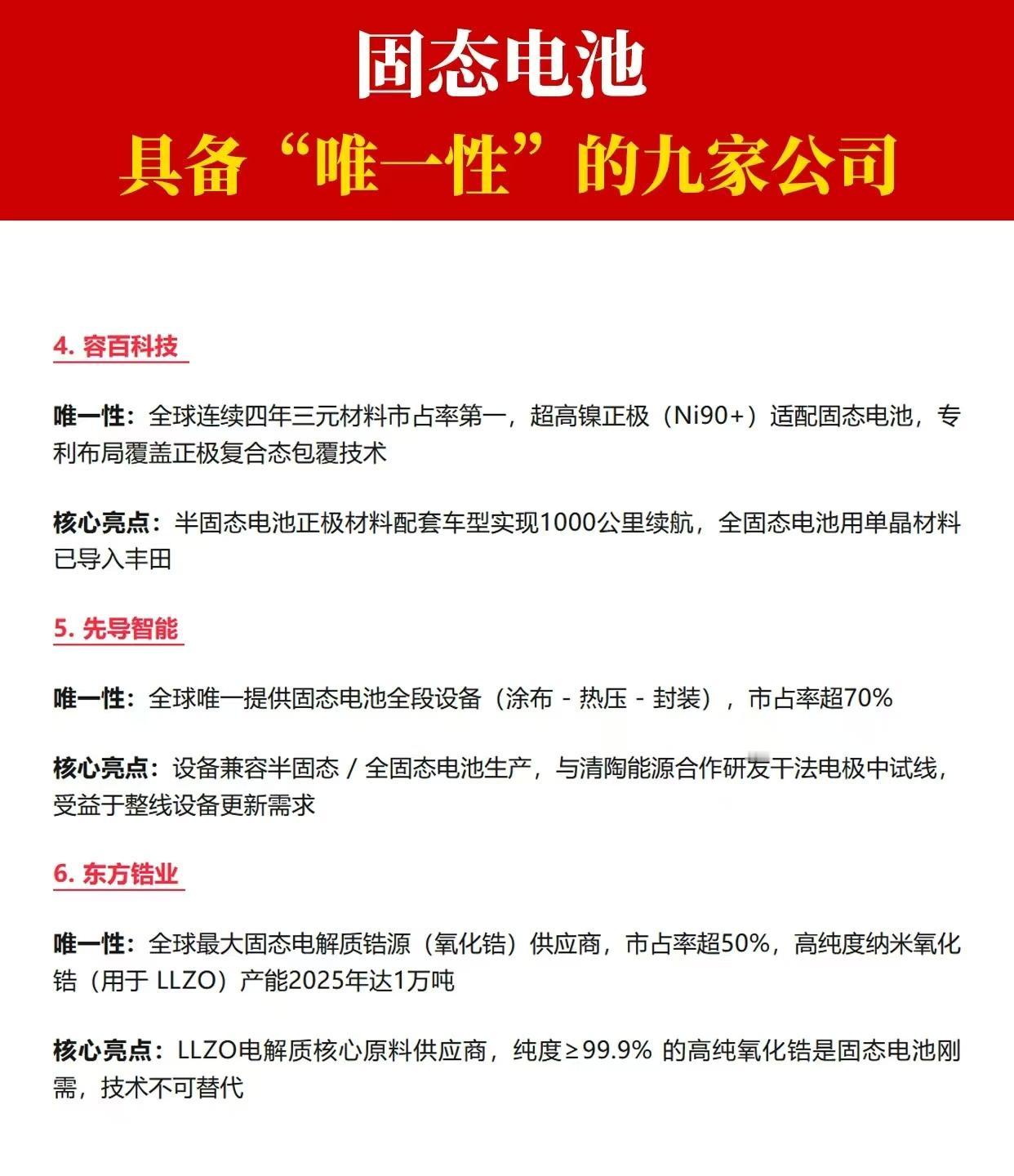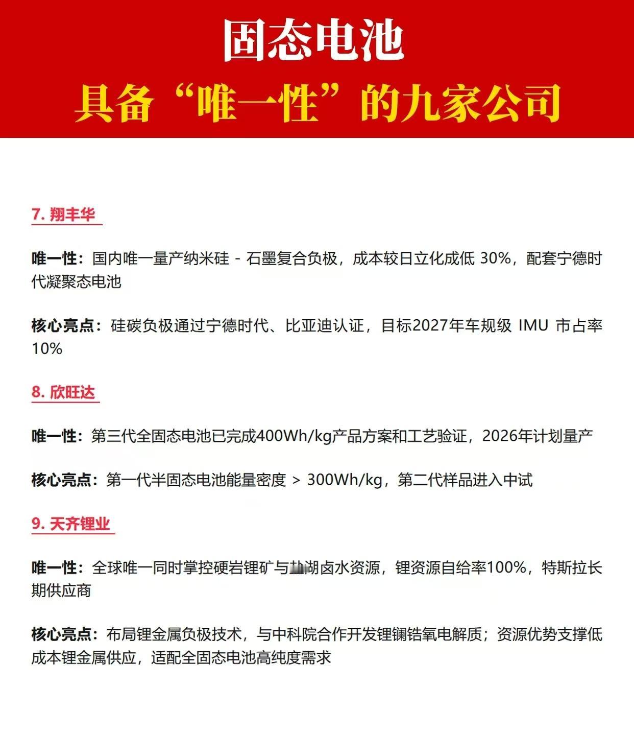 固态电池最新利好来袭! 10月30日,一则振奋人心的消息传来!清华大学深圳国际研究生院康飞宇教授团队联合天津大学杨全红教授团队,在国际顶级期刊《自然》发表重要成果。固态电池概念具备唯一性的龙头企业有哪些? 在固态电池领域,多家企业凭借“唯一性”优势领跑行业:宁德时代全球动力电池装车量第一;赣锋锂业是全球唯一覆盖氧化物/硫化物/聚合物三条技术路线的锂资源龙头;容百科技全球连续四年三元材料市占率第一;先导智能是全球唯一提供固态电池全段设备的企业;东方锆业是全球最大固态电解质锆源供应商;翔丰华是国内唯一量产纳米硅-石墨复合负极的企业;天齐锂业全球唯一同时掌控硬岩锂矿与盐湖卤水资源。 资料取材网络仅供参考不能作为投资依据,理财有风险入市需谨慎!