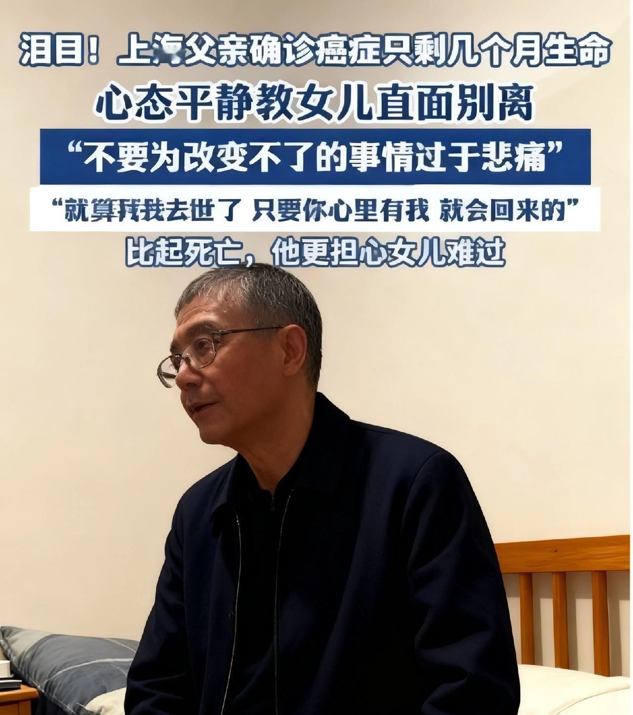 真的看哭了!上海这位爸爸确诊胰腺癌晚期,知道没多少日子了,反倒平静跟女儿告别:“就当爸爸去旅行啦,想我就抬头看看,我一直都在。” 还叮嘱女儿要坚强,哭完就笑、活好自己。老婆和女儿哭得不行,他却笑着摸女儿的头,说能看到她长大就很幸福。 这份温柔的告别太戳心了,深沉的爱真的能跨越生死,这才是最棒的父爱啊~