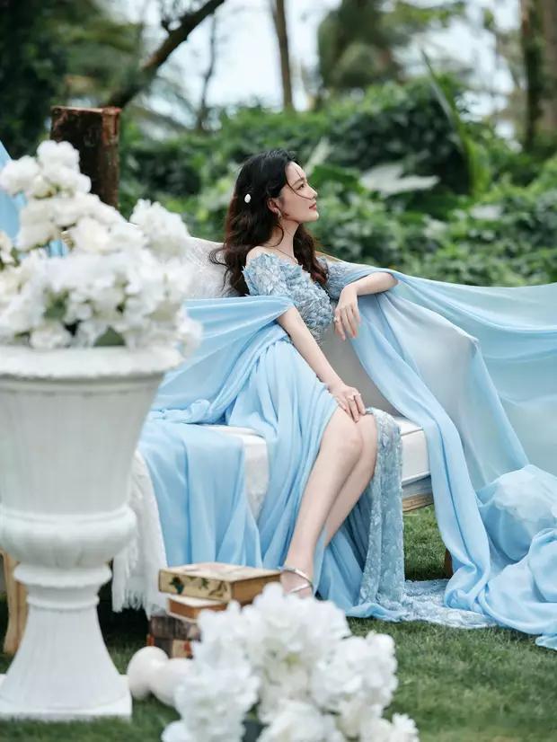 分享娱乐[超话]分享娱乐李沁穿蓝色礼裙仙气飘飘,卷发造型优雅俏皮