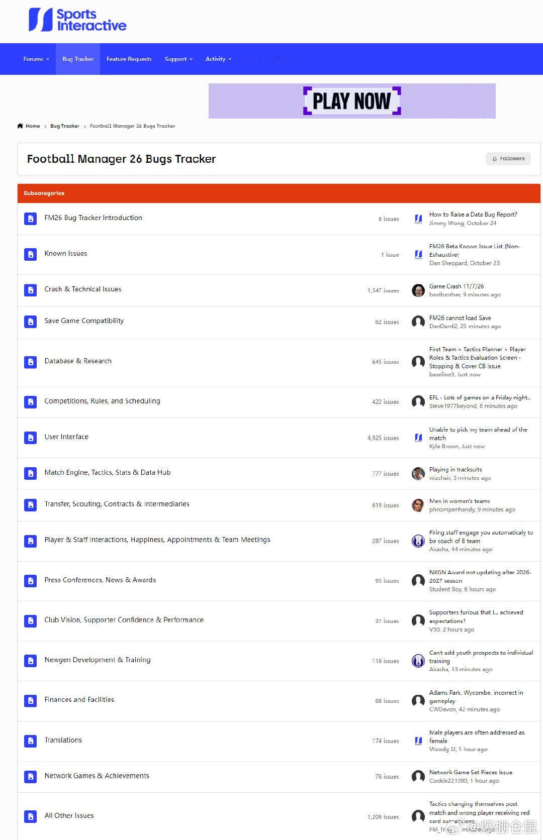 【足球经理26,bug26!】官方论坛的bug反馈区共有11083个条目,其中反映最多的是接近5000条条目的UI问题!第二是崩溃和其他技术问题,其他的问题也是多如牛毛,包括存档,数据库和搜索,杯赛&规则&日程,比赛引擎&战术,转会&球探&合同等等等等。