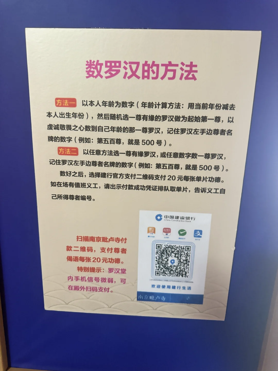 方法1️⃣:以本人年龄为数字(年龄计算方法:用当前年份减去本人出生年份),然后随机选一尊有缘的罗汉做为起始第一尊,以虔诚敬畏之心数到自己年龄的那一尊罗汉(可上下数、跳跃数、倒着数、顺着数,随心随缘),记住罗汉左手边尊者名牌的数字(例如:第五百尊,就是500号)。