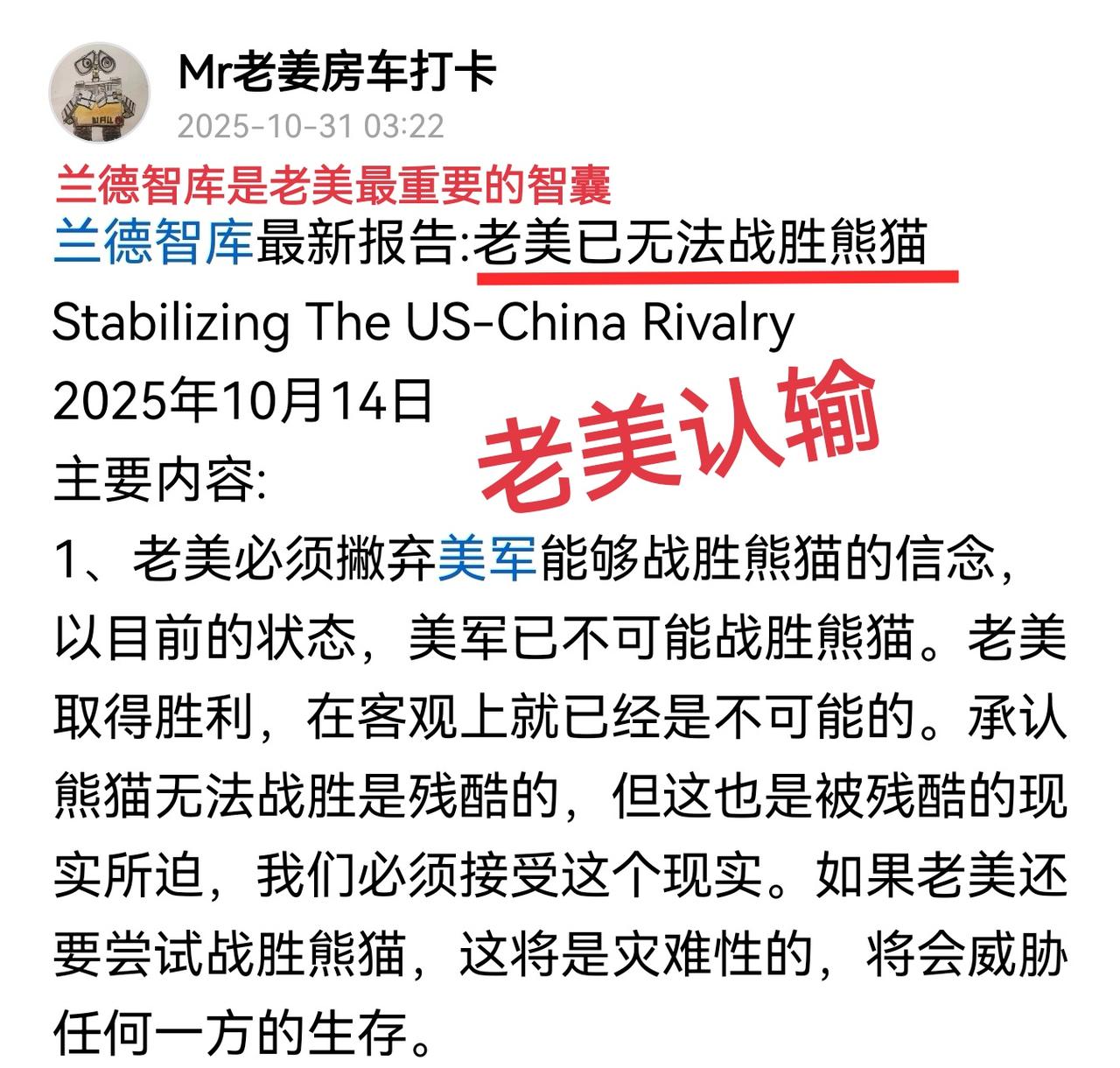 兰德智库最新报告:老美已无法战胜熊猫 Stabilizing The US-Ch
