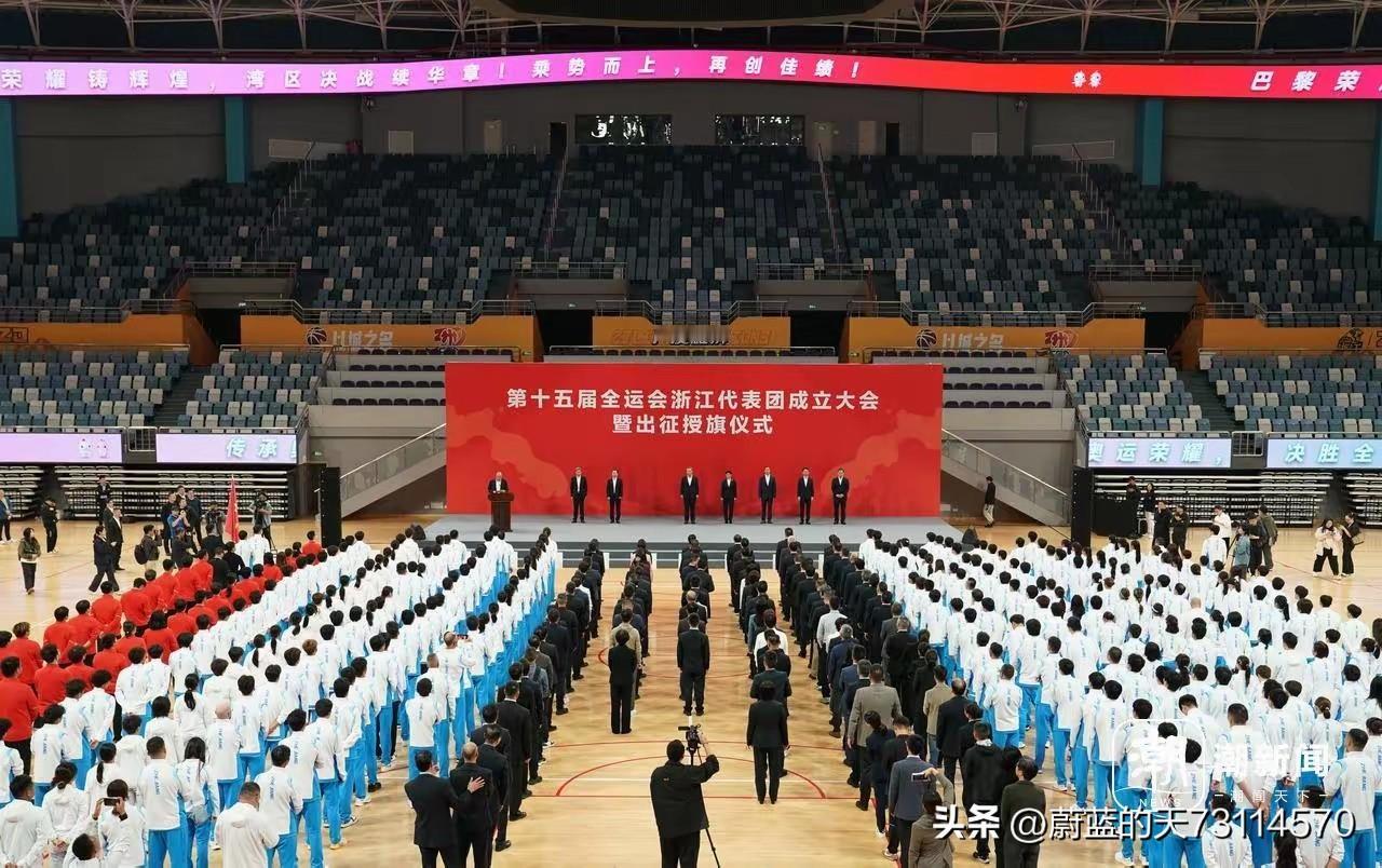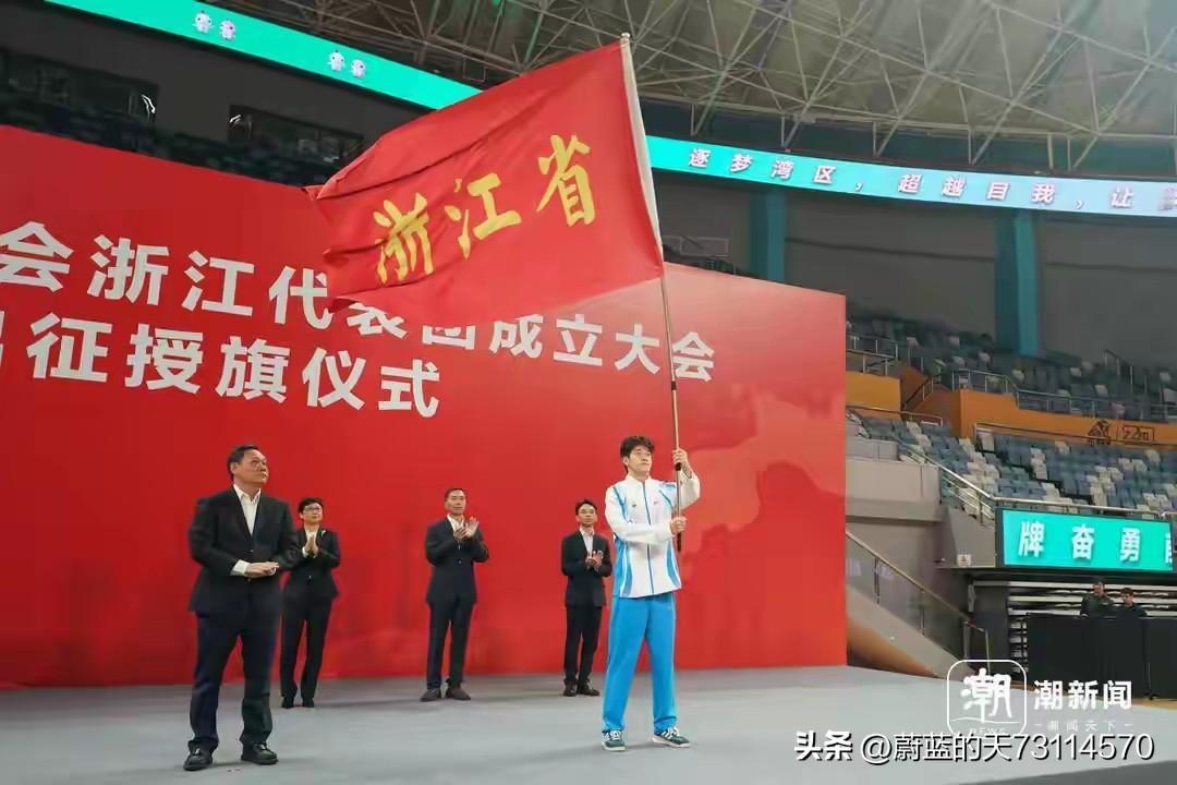 [玫瑰][玫瑰]第十五届全运会浙江体育代表团授旗出征的消息: 1,10月30日下午,第15届全运会浙江体育代表团成立大会暨出征授旗仪式在浙江杭州黄龙体育中心举行。 2,浙江体育代表团团长李岩益向副团长、省体育局副局长占旭刚授旗,运动员代表,游泳奥运会冠军潘展乐接旗。 3,全运会浙江运动员共有824人,其中:男428人,女396人,将参加28个大项,43个分项的竞技比赛。运动员平均年龄20.4岁。队伍阵容整齐,结构合理,拥有很强的竞争力。 4,全运会浙江运动员将在游泳、田径部分项目、羽毛球、射击气步枪、跆拳道、水上项目(帆船、赛艇、皮划艇等)、举重、攀岩等优势项目上担起夺金的重任。 5,全运会竞技体育设34个大项,419个小项,群众赛事设23个大项,166个小项。截止10月30日, 浙江选手在竞技体育项目上已收获9金8银2铜,计19枚奖牌,暂排金牌榜和奖牌榜第一。群众赛事上也已收获10枚金牌。 6,第十五届全运会浙江竞技体育的目标是稳三争二,取得运动成绩和精神文明的双丰收,在全运会上展现出浙江精神,浙江风采!