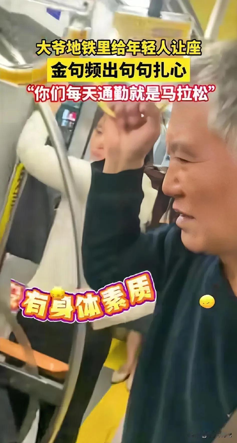 北京地铁上,一位大爷看你小伙儿站在那里,无精打采,主动起身,说道:“小伙子,你坐这”,可小伙想推辞,没想到,大爷开口道:“你们年轻人太不容易了,每天通勤就是马拉松。” 这一幕发生在北京地铁上,这可把同车的乘客给惊呆了。 "小伙子,你坐吧,我体力好着呢!"大爷笑着说,"我最近还报名了北京马拉松,可惜了没中签,站这正好当锻炼一下!" 大爷这一说,把小伙说的可不好意思,然而,大爷接下来的这句话,深深触动了在场的乘客。 大爷接着说:"年轻人现在是真不容易,每天通勤上下班,那才是真正的马拉松!" 这一幕画面被人拍下发到网上,网友纷纷留言: 有的说:“大爷对年轻人是真好,不光让座,还让免单。” 也有的说:“北京大爷真的,句句关心,句句扎心。” 还有的说:“大爷这话有道理,你们年轻人啊,太有素质了,可惜没有身体素质。” 说实话,现在谁上班不累?早上挤地铁一两小时,晚上加完班再挤回去,到家累得连饭都不想做。天天这么折腾,可不就是没终点的马拉松。 地铁上天天都有让座的,但都是年轻人给老人让座,这位大爷的做法让人看着就舒服。 是地铁上多一点这样互相体谅,少一点争执和指责,这城市会不会温暖一点? 你怎么看这件事?如果你是那个年轻人,会接受大爷的好意吗? 来源:今日热点