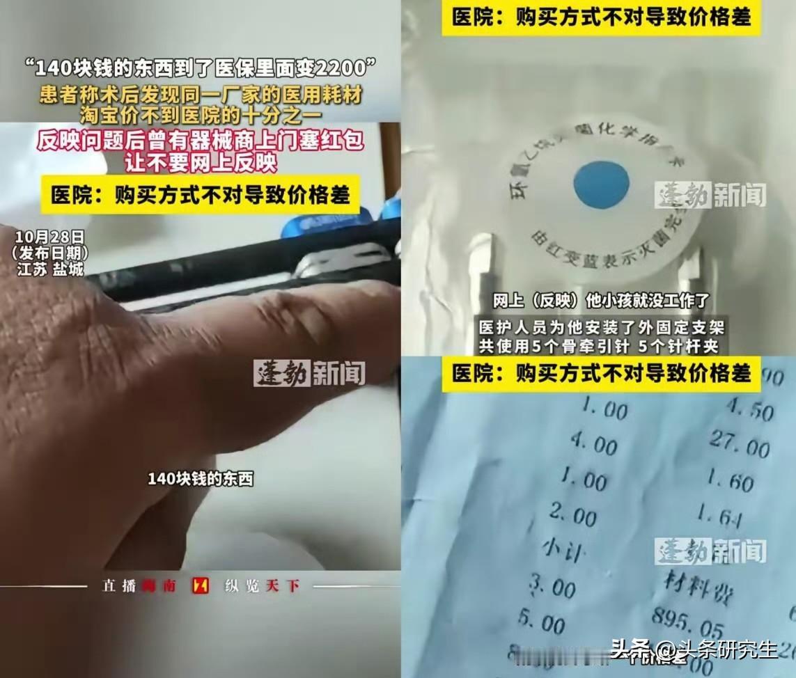医保采购的猫腻,藏不住了吧! 江苏盐城的黄先生做完腿部骨折手术,才发现自己用的骨牵引针和针杆夹,医院收费分别是483元和2200元。他顺手查了下淘宝,同厂同型号的耗材,网上只卖42元和168元,价差足足十倍。这事被捅破后,医院小程序上相关耗材价格悄悄下调,还有人上门塞红包,想让他别再声张。 医院把责任推给医保局,说用的是阳光采购平台,医院没有自主定价权。但投诉后价格能迅速下调,又该作何解释。这背后的水分,恐怕不是渠道差异能轻飘飘带过的。 有人说医保支付就是原价,习惯了。但这种糊涂账,不能总让患者和医保基金来扛。骨牵引针这类耗材,采购价为何能与市场价脱节如此严重。是采购环节缺乏竞争,还是中间环节存在加码行为,需要给个明白话。 值得关注的是,国家医保局已在其他地方着手挤压这类价格水分。比如针对中心静脉给药耗材,通过约谈企业,将输液港的价格从5000到10000元压到了2700元以下,降价空间主要来自压缩流通环节的水分。这说明价格虚高并非无解,关键看能否打破信息不透明,真正推动全链条价格公开。 医保基金是群众的救命钱,也是医疗系统公信力的基石。当同质耗材出现十倍价差,受损的不只是患者的钱包,更是整个医保系统的健康度。阳光采购平台必须真正晒在阳光下,才能让患者明白付费,否则所谓的阳光,反倒成了遮羞布。