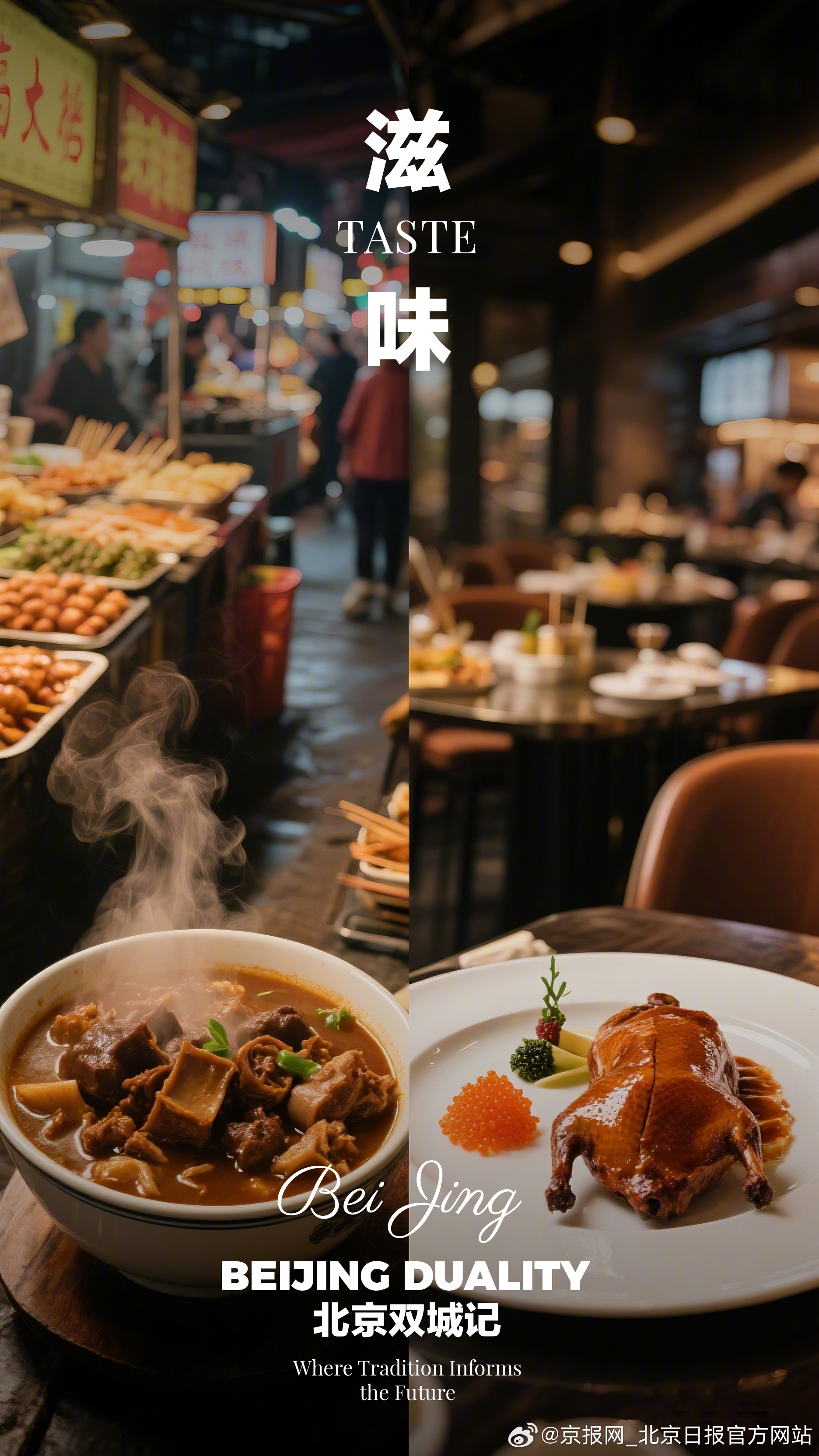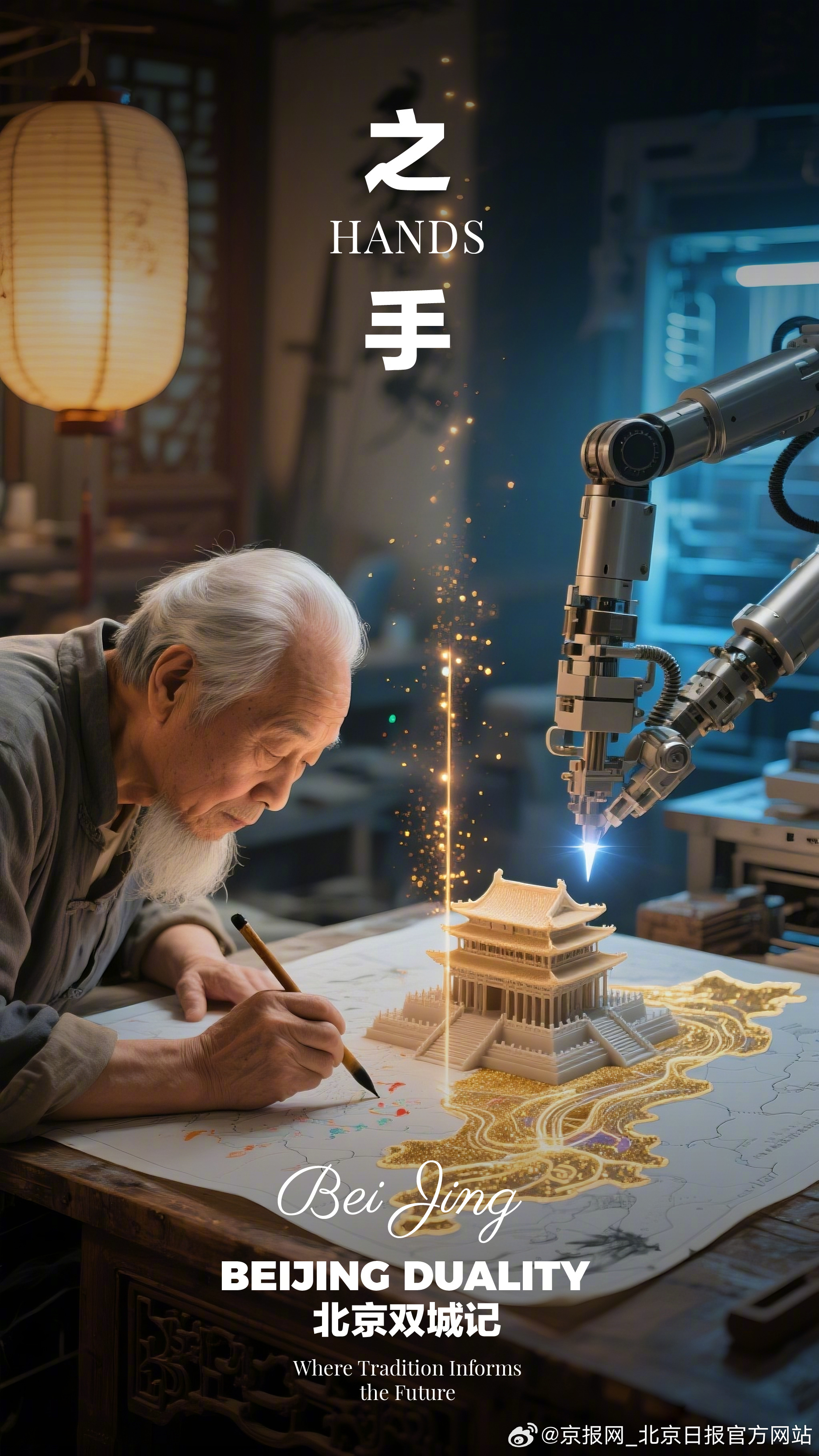 #我AI北京第二届城市形象创作征集优秀作品展播#【我AI北京|BEIJING | DUALITY (北京 | 双城记)】 一碗胡同卤煮的烟火气,撞上餐厅烤鸭精致摆盘;老匠人手中的毛笔,与机械臂的激光在同一张图纸上共舞……当北京传统与未来共生在镜头下折叠,每一张都写着最生动的文化自信。(作者:麻丽婷)