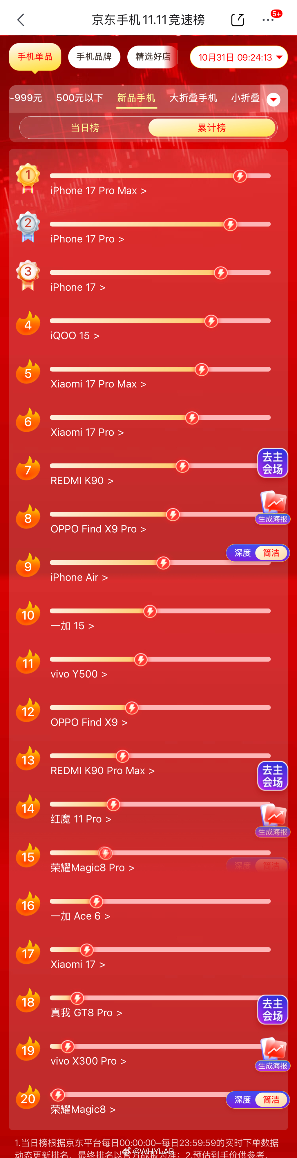 某东竞速榜,双 11 红魔 11 Pro 累计销量,在 6000 元以上全部手机中,排名第 9;新品手机中排名 14,比一些品牌 Pro 机型销量还高(不乏一些大厂)。