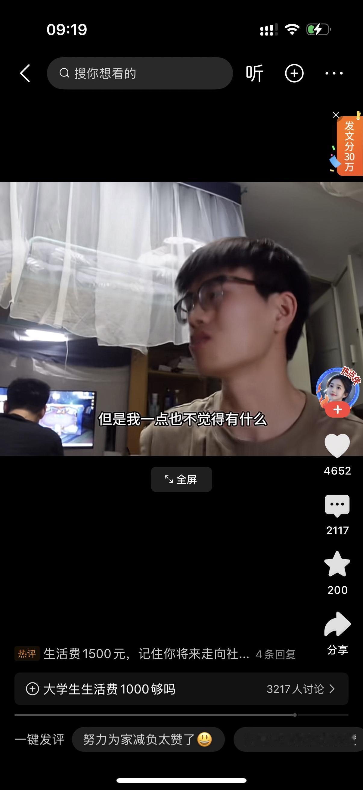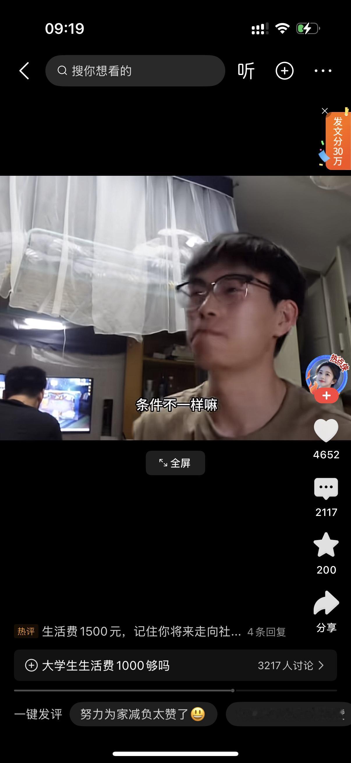 男生无意之中得知舍友一个月3000块钱的生活费,有点惊讶,因为他一个月才1500。他又问了另外一个舍友,你多少啊?3000。你也3000啊,男生内心还是有点失落的。不过很快他就淡定下来,说,不瞒你们,我一直是1500一个月的生活费。不过没关系,条件不一样嘛。我自己通过打工去赚取一些生活费,也够用。我也不会自卑的,相反通过自己的努力给父母减轻一些负担,我很自豪。孩子,你是好样的,你不会比拿3000块生活费的同学差的,加油。