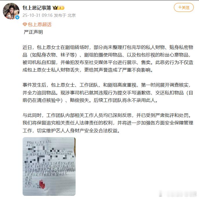 包上恩私人物品被司机扣留售卖 31日,发严正声明,透露近日在剧组转场时,部分尚未整理打包完毕的私人财物、贴身私密物品(如贴身衣物、袜子等)、剧组拍摄使用物品、以及珍视的粉丝心意物品,“被司机私自扣留,并偷拍发布至社交媒体平台进行展示、售卖。”目前,涉事司机已就其违规行为提交手写道歉信、交还私扣物品、赔偿损失。