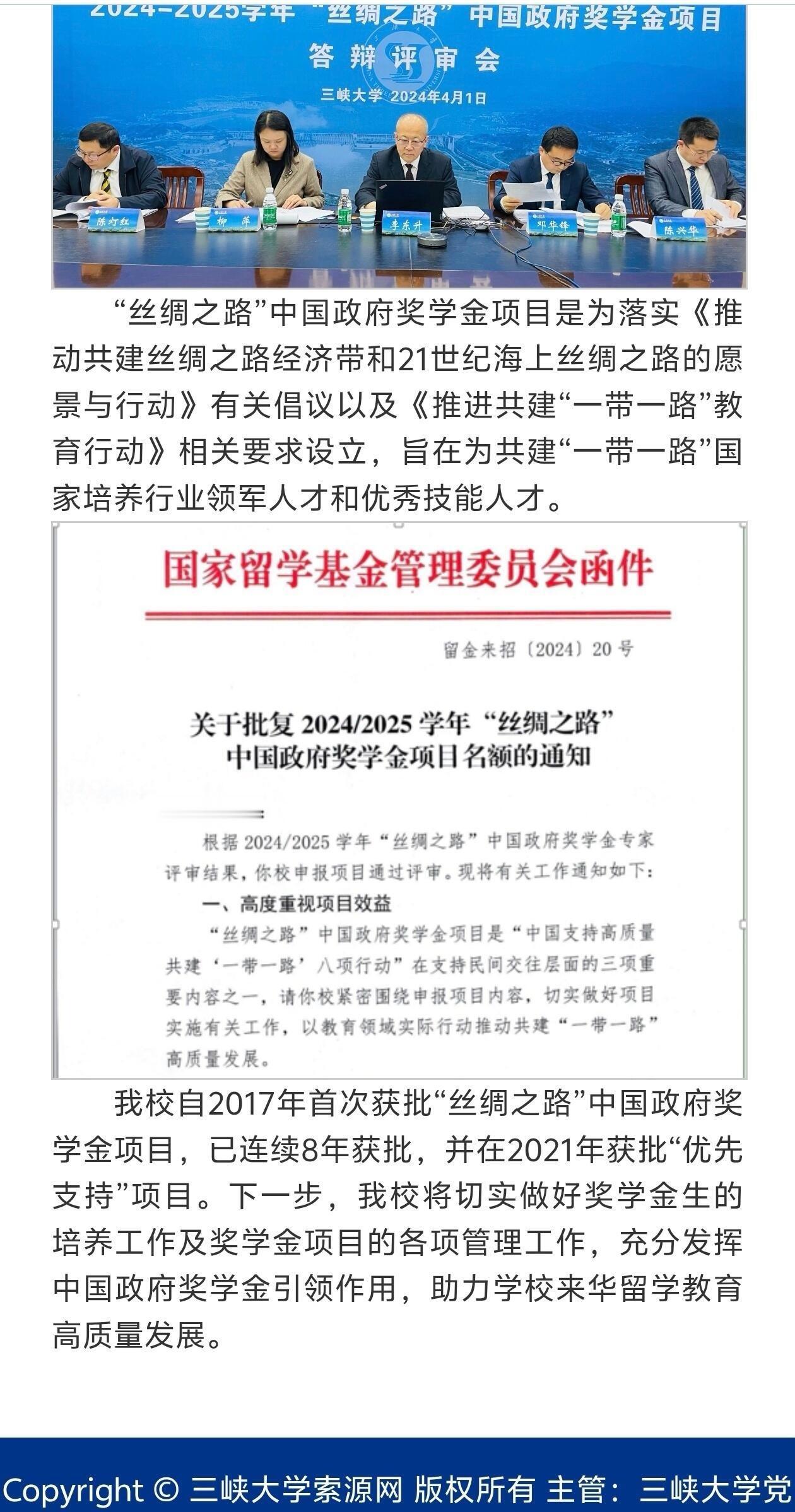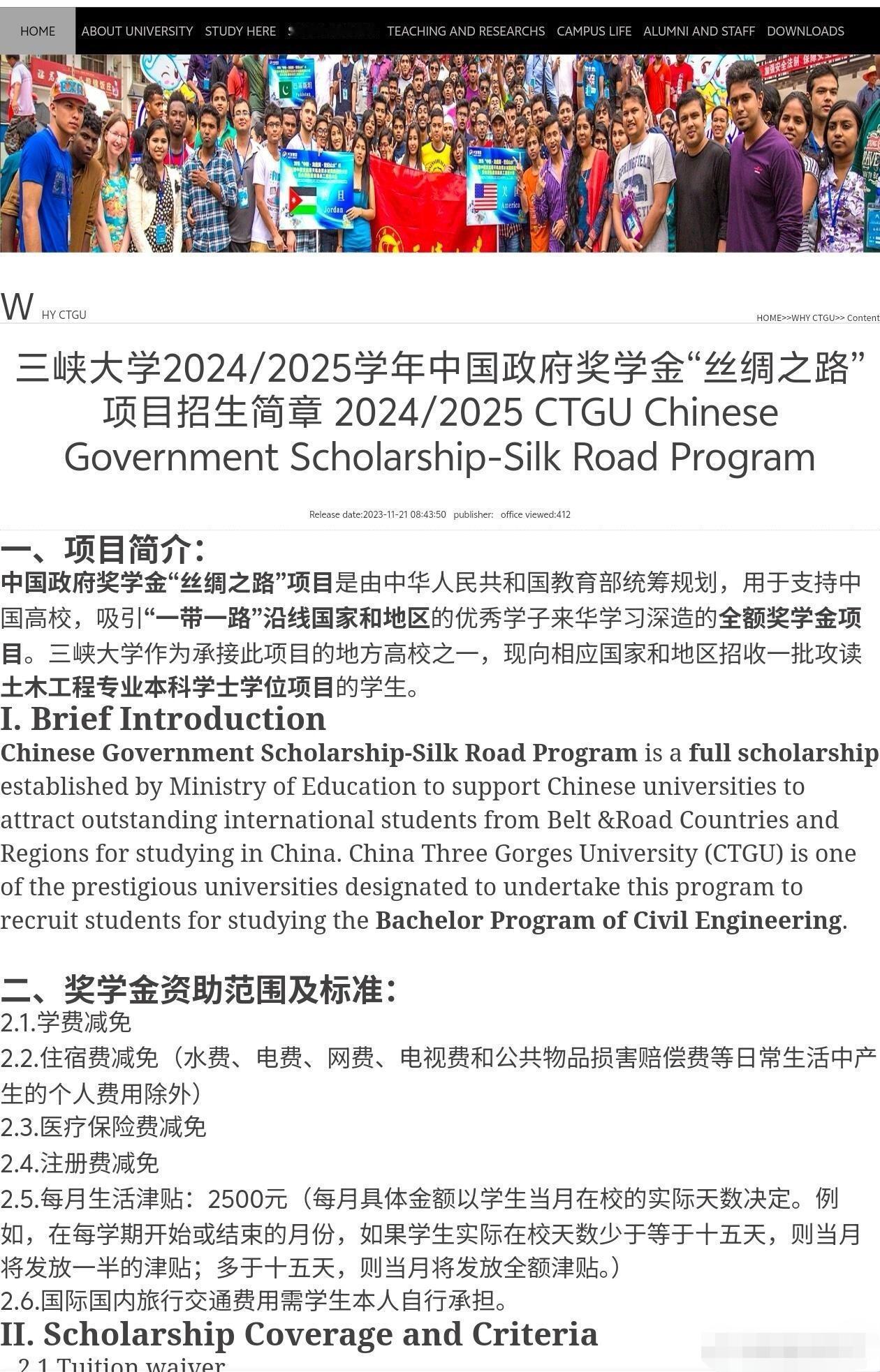 三峡大学自2017开始 获批来华留学生“丝绸之路”中国政府奖学金项目。 奖学金资助范围:1.学费减免、2.住宿费减免3.医疗保险费减免、4.注册费减免、5.每月生活津贴:2500元 。