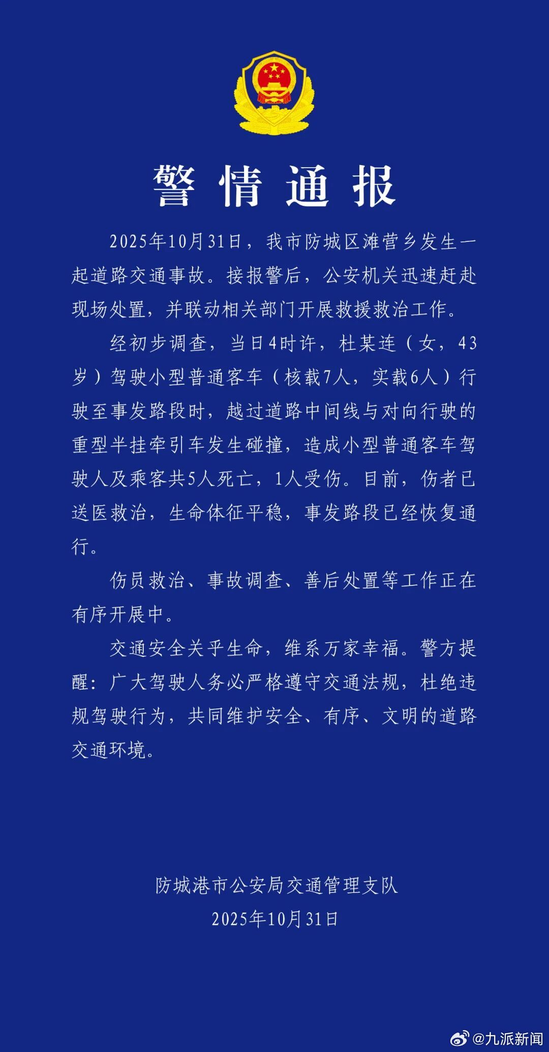 【#广西警方通报5死1伤交通事故#】10月31日,广西防城港市公安局交通管理支队发布警情通报:“2025年10月31日,我市防城区滩营乡发生一起道路交通事故。接报警后,公安机关迅速赶赴现场处置,并联动相关部门开展救援救治工作,经初步调查,当日4时许,杜某连(女,43岁)驾驶小型普通客车(核载7人,实载6人)行驶至事发路段时,越过道路中间线与对向行驶的重型半挂牵引车发生碰撞,造成小型普通客车驾驶人及乘客共5人死亡,1人受伤。目前,伤者已送医救治,生命体征平稳,事发路段已经恢复通行。伤员救治、事故调查、善后处置等工作正在有序开展中。”