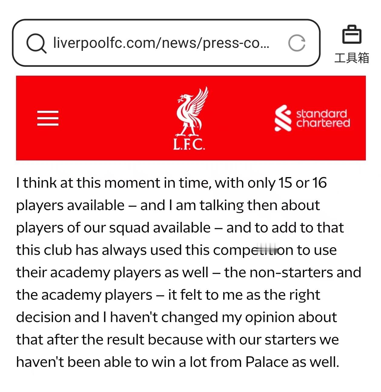 虽然但是,斯洛特说的原文并不是“哪怕我们这次上主力,也赢不了水晶宫”,而是用的过去式陈述:“之前联赛、社区盾上主力对水晶宫,也没取得好成绩”。当然中文翻译带节奏容易,要辟谣就没什么人看了[笑cry]