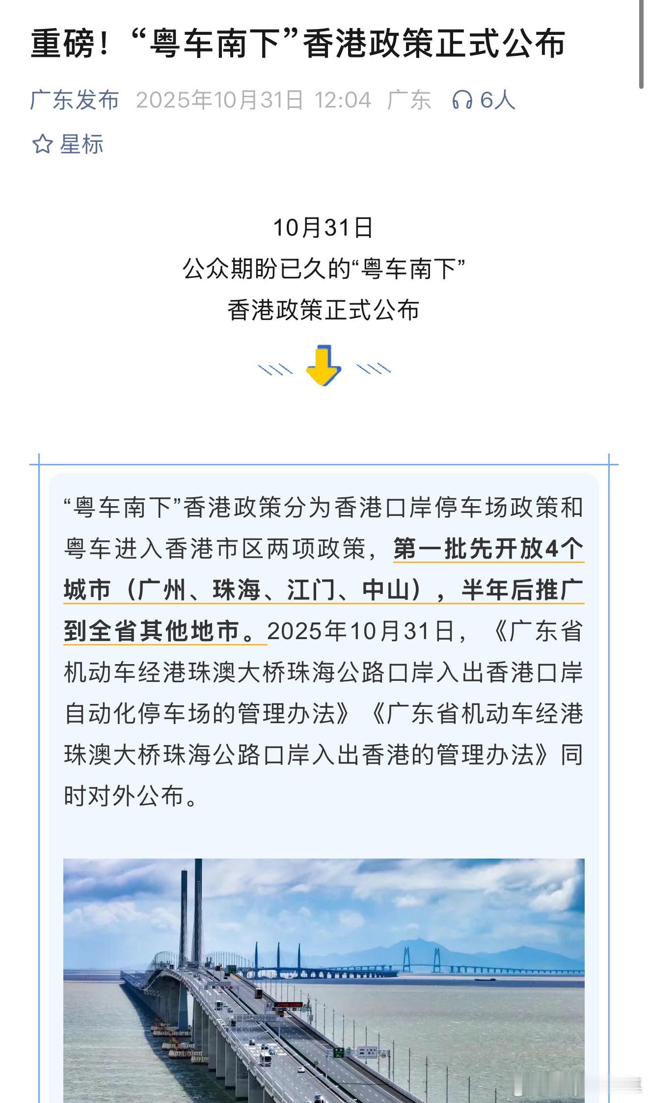 粤车南下条例正式公布!首批开放城市为广州、江门、珠海及中山,大家准备开什么车过去香港[馋嘴][馋嘴]粤车南下