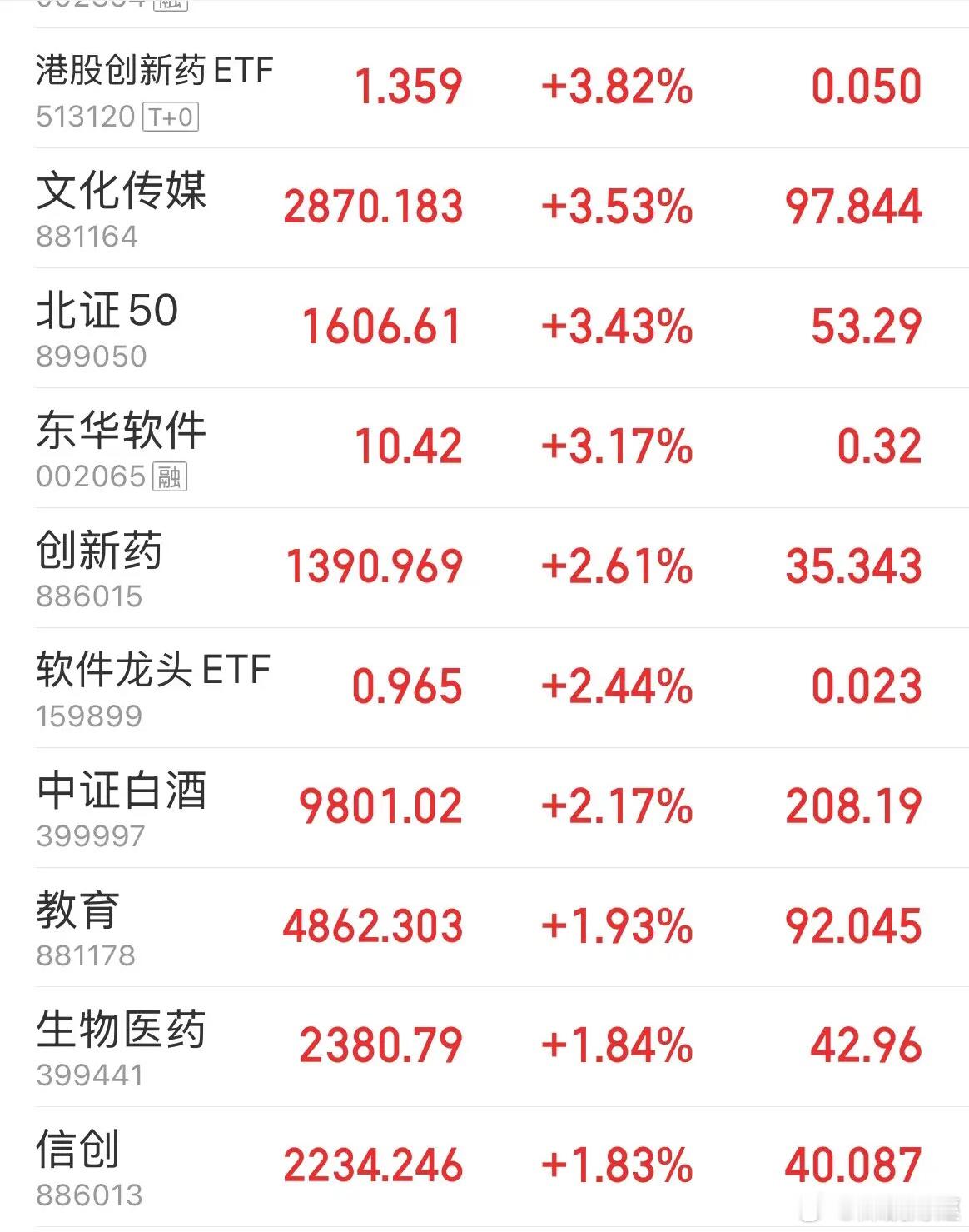 而白酒今天大涨超2%,信创、机器人、人工智能大涨超1.5%,文化传媒大涨超3%,这算是在10月最后一天,满盘洗刷刷一下,