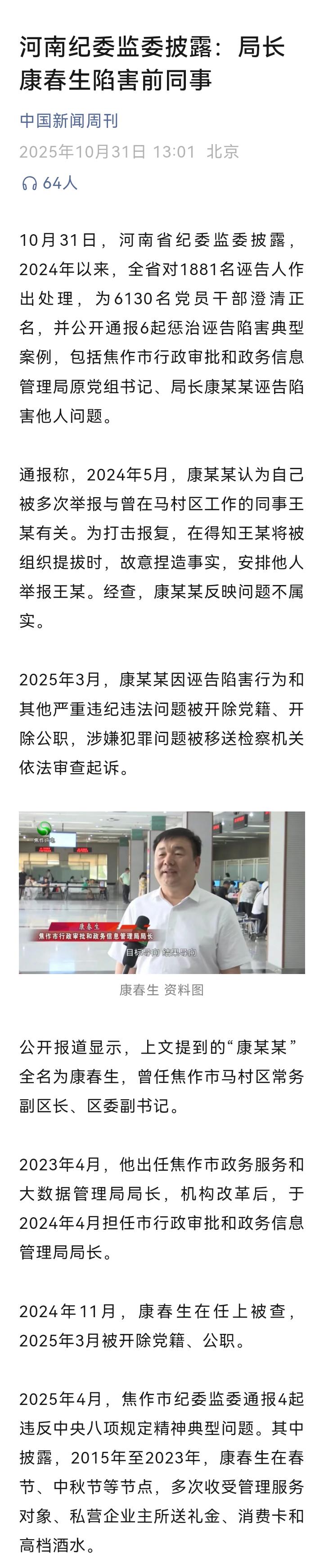 人心险恶啊,仅一年就有1800多人诬告,6100多人被诬告!河南官场这场“举报潮”,揭开了多少人的遮羞布(详见附图)? 10月31日,河南省纪委监委通报了一组触目惊心的数据:仅2024年以来,全省竟有1881人因诬告被处理,同时为6130名党员干部澄清正名。更讽刺的是,带头诬告的竟是焦作市行政审批局原“一把手”康某某——自己屁股不干净,反而恶人先告状! 这数字背后,暴露了官场两大毒瘤: 一是“举报成风”,有人把诬告当工具。自己贪腐渎职,却想靠“泼脏水”拖垮对手;能力不足,就靠“搞臭别人”上位。官场成了“举报战场”,实干者寒心,投机者猖狂! 二是“清官难当”,澄清成本远超诬告成本。一个莫须有的罪名,可能需要组织耗费数月调查,而诬告者往往轻描淡写受罚。如果不严惩,谁还敢担当作为? 河南这次“亮剑”,传递了一个明确信号:诬告者,绝不姑息;清白者,坚决保护! 但同时我们更需要思考一下:为什么诬告屡禁不止?是考核机制急功近利,还是监督体系仍然有漏洞? 官场不是江湖,举报不是儿戏。只有让诬告者“搬砖砸脚”,让实干者挺直腰杆,才能撕破利益网! “人们啊,要警惕!”这是一句名言,知道是谁说的吗? 知道者请在评论区告诉大家吧,谢谢!河南 举报 官场感悟