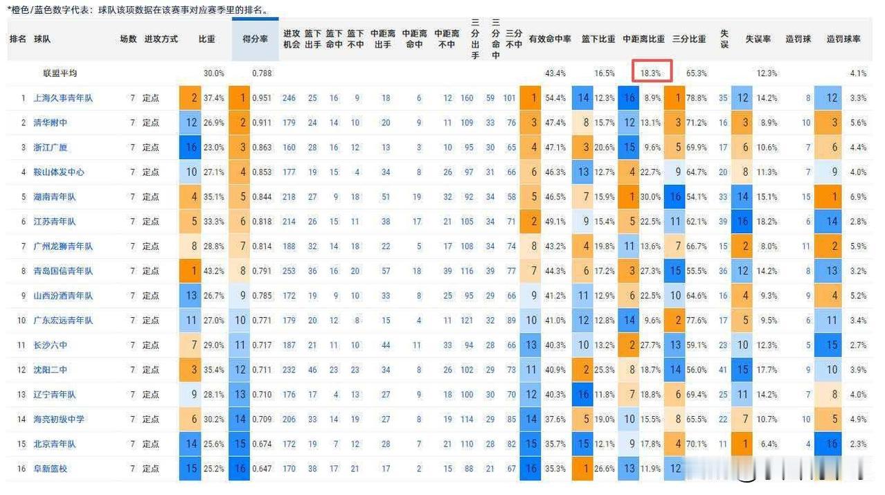 基本功太差!U17青年联赛三分球整体命中率才29.3% 近日看到全国U17青年联赛的数据分析,看了U17青年联赛的各队的进攻效率,感觉这基本功真的很弱,整个联赛三分球整体命中率才29.3%,表现最好的上海队才36%刚刚算得上合格,第二名的广东青年队就只有31.5%,整体的中距离命中率为才33.3%。 感觉国内青年联赛的投篮命中率真的太低了,这也是中国男篮为什么在国际比赛里那么弱的主要原因,没办法,基本功太差了。
