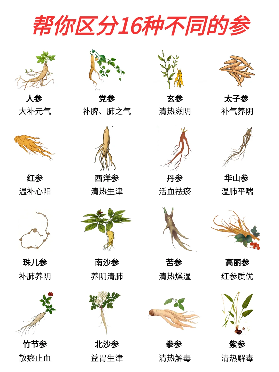 ⭕人参:补全身元气,重点补心、肺、脾之气