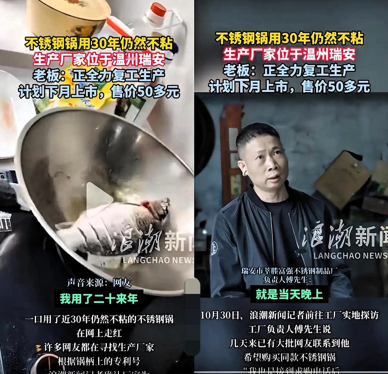 一觉醒来 生产锅具的厂家懵圈了 万万没想到,半路杀出个程咬金,浙江瑞安一个停产的不锈钢锅 30 年不粘不锈被全网搜索。 ​ 温州陈女士的一条视频,让全网挖到了宝!她家里那口不锈钢老锅用了二三十年,煎蛋滑溜溜、钢丝球随便造,照样不粘不锈。网友顺着锅柄上的“952271591”专利号,直接扒出了瑞安早已停产10年的莘塍富强不锈钢制品厂,40万赞、2000多万阅读把厂家负责人傅克萍都整懵了。 设备都落灰了,架不住网友疯狂催单,厂家赶紧重启生产线,新锅还升级了加厚不锈钢和激光焊接锅柄,价格才60来块!这事儿真的狠狠戳中了大家:不是我们不爱国货,而是这样耐用又实在的好东西太少了! 这口“复活”的老锅,你打算冲一波吗?来评论区聊聊!不锈铁锅 你对甄志强的哪部作品印象最深