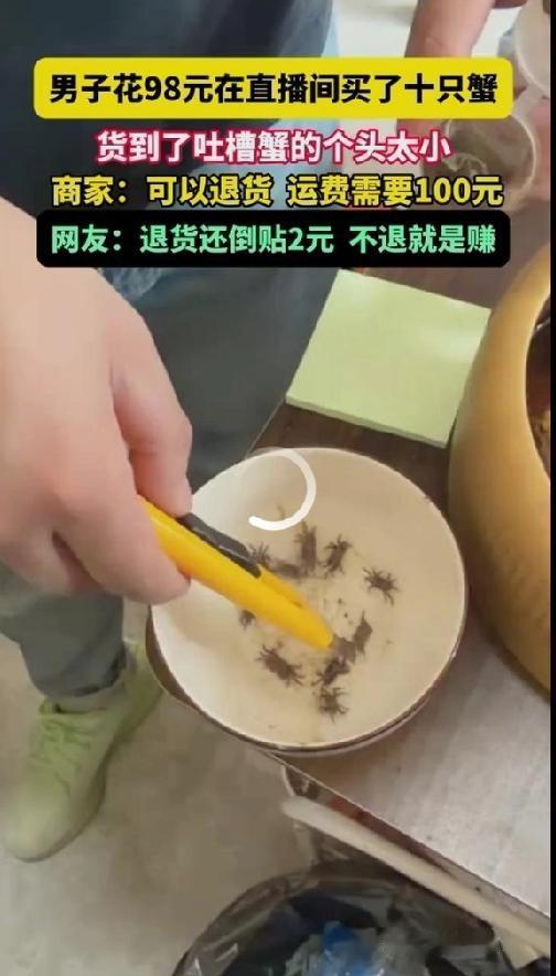 98块买10只蟹, 退货要100运费? 江苏大哥直播间下单,收到的蟹个头小得离谱,找商家退货,对方说运费得100块。 退了倒贴2块,不退又憋屈,这不纯纯拿捏消费者嘛!商家就是算准了大家不想麻烦、不愿倒贴,才搞这套路。 表面给退货权,实则设陷阱,比直接不售后还膈应。 你们碰到过这种“退亏不退也亏”的事吗?会怎么处理?