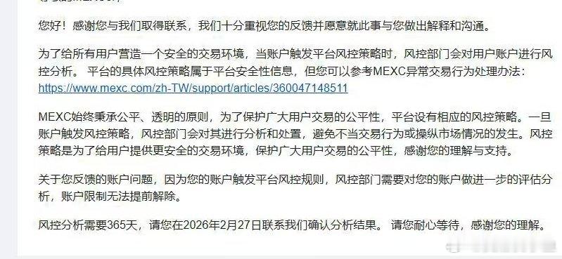 此外,有其他用户透露,抹茶方面告知其“风控分析流程可能长达365天”,进一步加剧了用户对平台处理效率的质疑。