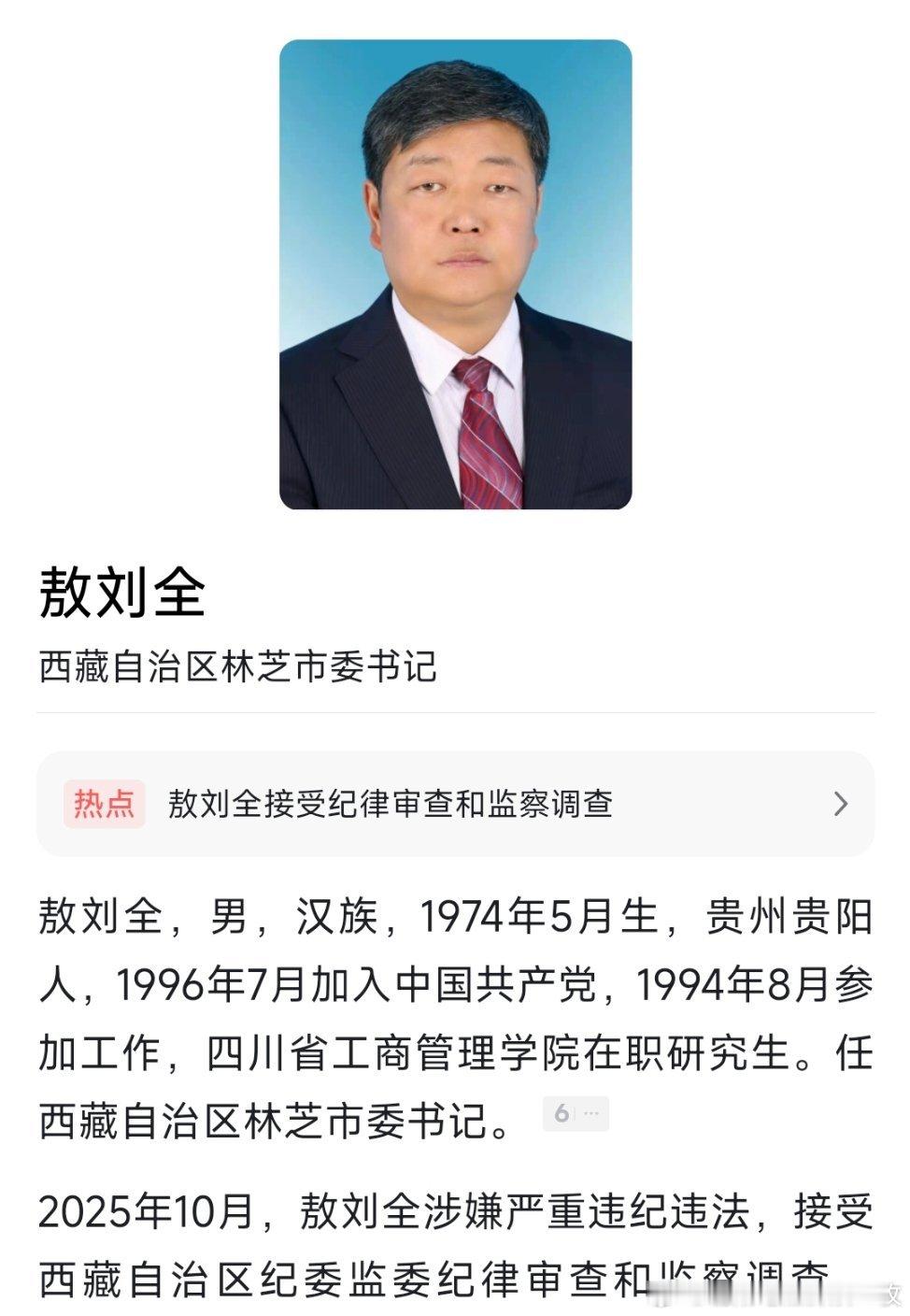 据西藏自治区纪委监委10月31日消息:西藏自治区林芝市委书记敖刘全涉嫌严重违纪违法,目前正接受西藏自治区纪委监委纪律审查和监察调查。热点现场