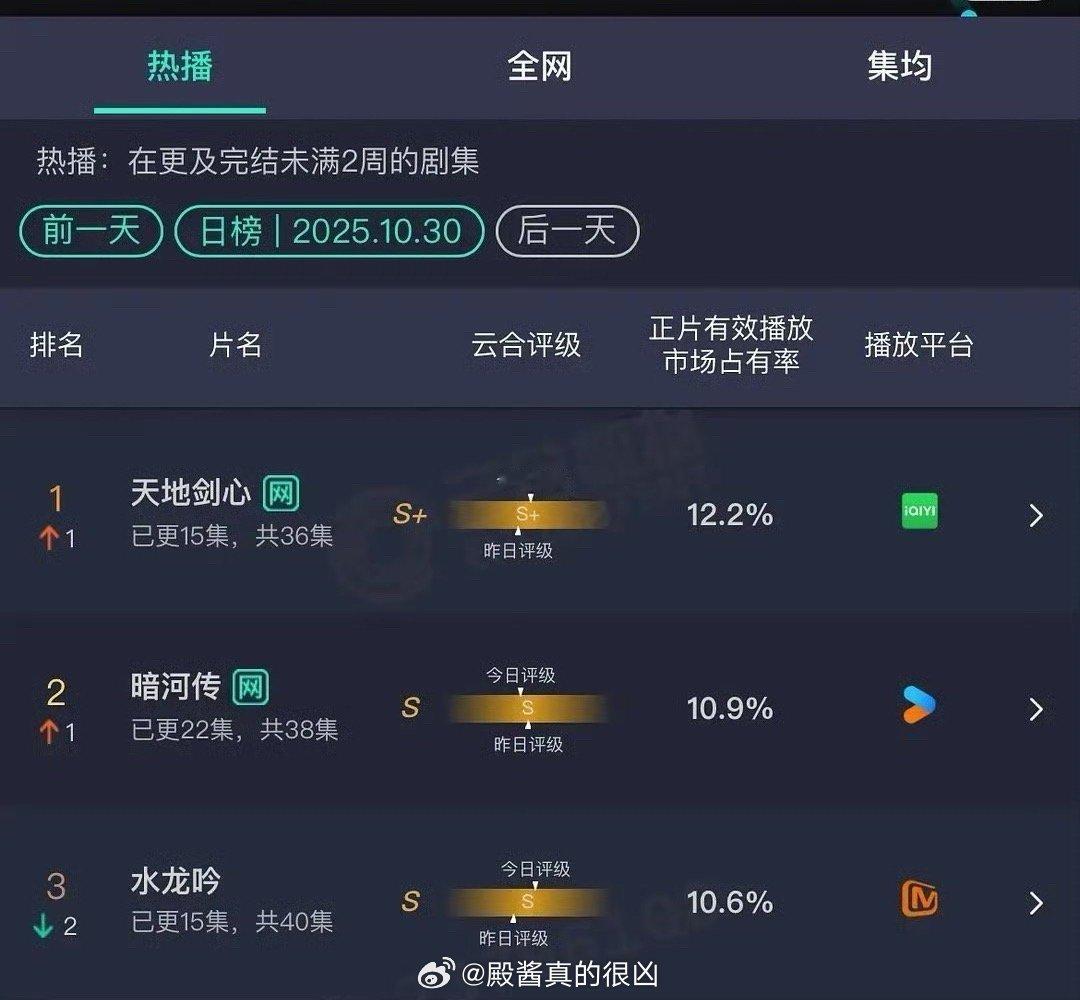 10月30日云合播放占比云合天地剑心12.2%爱奇艺双更这个数据登顶,祝它成功