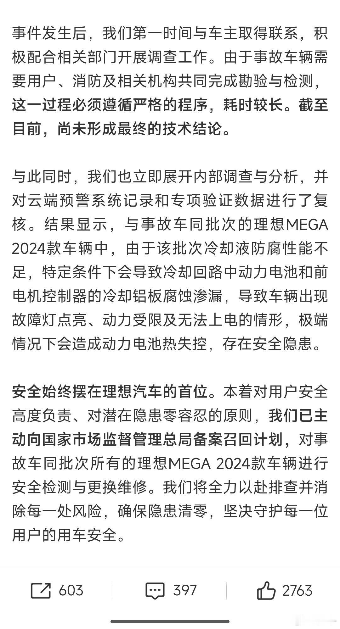 理想汽车已主动向国家市场监督管理总局备案召回计划,对事故车同批次所有的理想MEGA 2024款车辆进行安全检测与更换维修