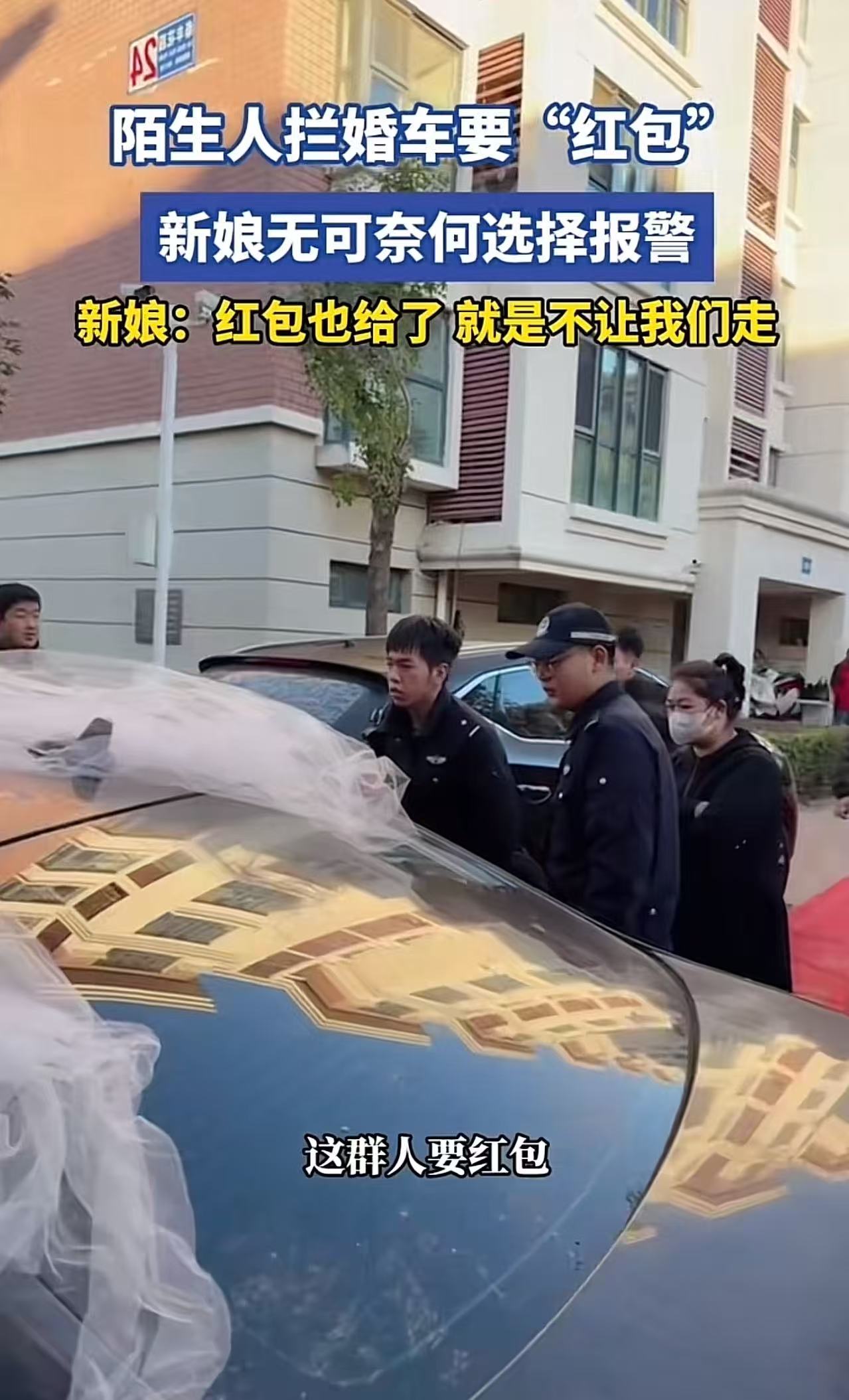 河北,陌生人拦婚车要“红包”,新娘无可奈何旋转报案!新娘:红包也给了,嫌少不让我们走!网友:拦婚车是哪个地方的风俗?非亲非故你有脸跟人家要几条香烟和红包?人家给你一根香烟就不错了,这完全就是拦路抢钱。