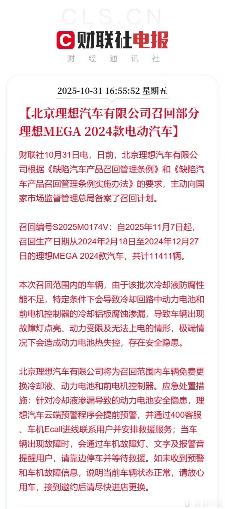 理想召回部分MEGA2024款,共计11411辆,免费更换冷却液,动力电池和前