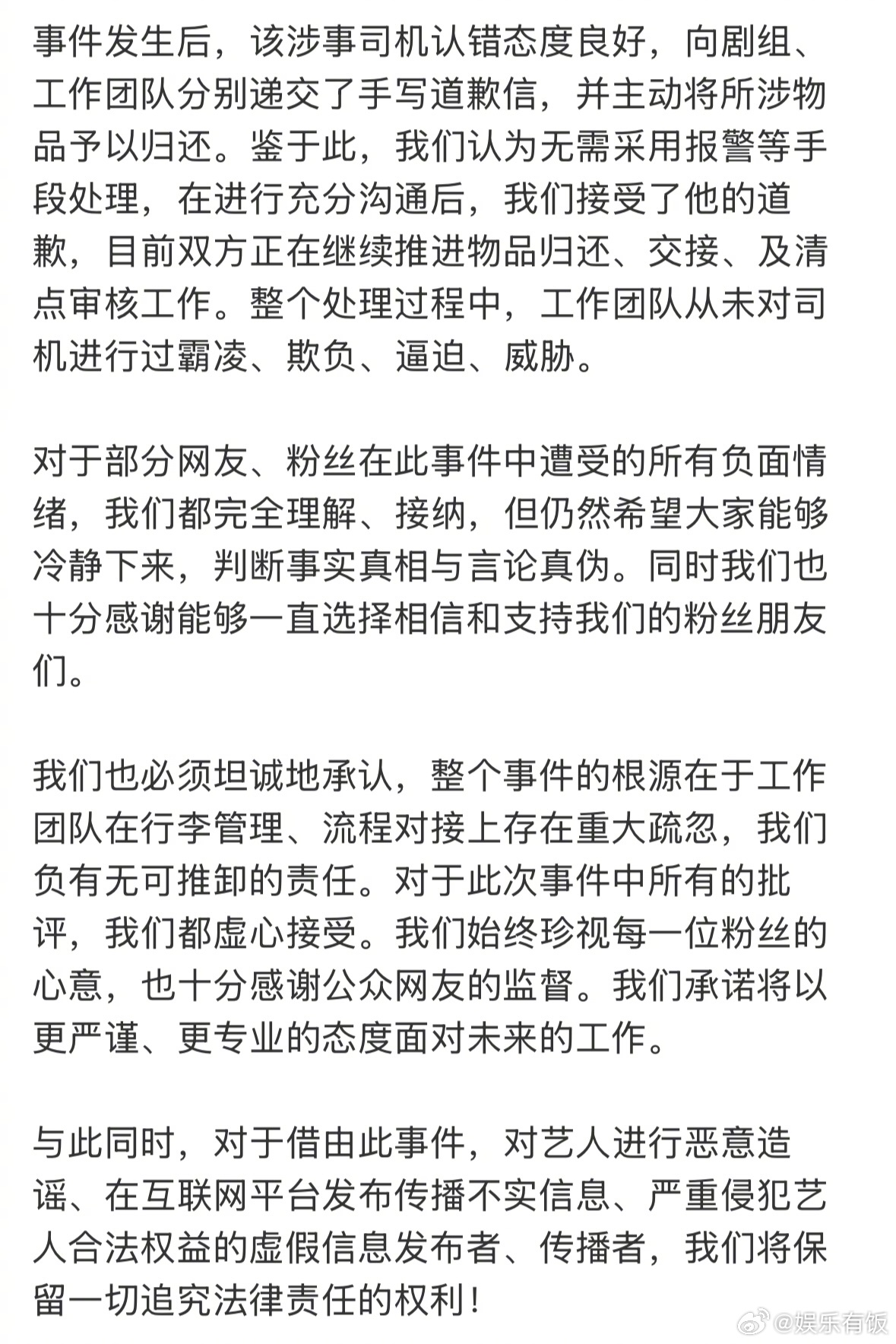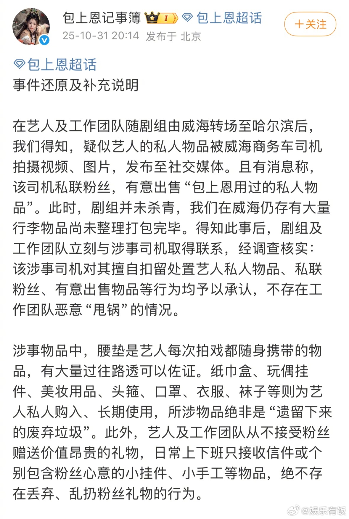 包上恩工作室发文澄清 包上恩工作室就包上恩私人物品被司机擅处事件发布声明,确认司机承认擅自扣留、拍摄并意图出售艺人日常自用的腰垫、玩偶等物品,目前已归还。团队承认自身在行李管理上存在重大疏忽并致歉,同时澄清物品绝非垃圾,也从未丢弃粉丝礼物。鉴于司机已书面道歉,团队决定不报警,并保留对恶意造谣者追究法律责任的权利。
