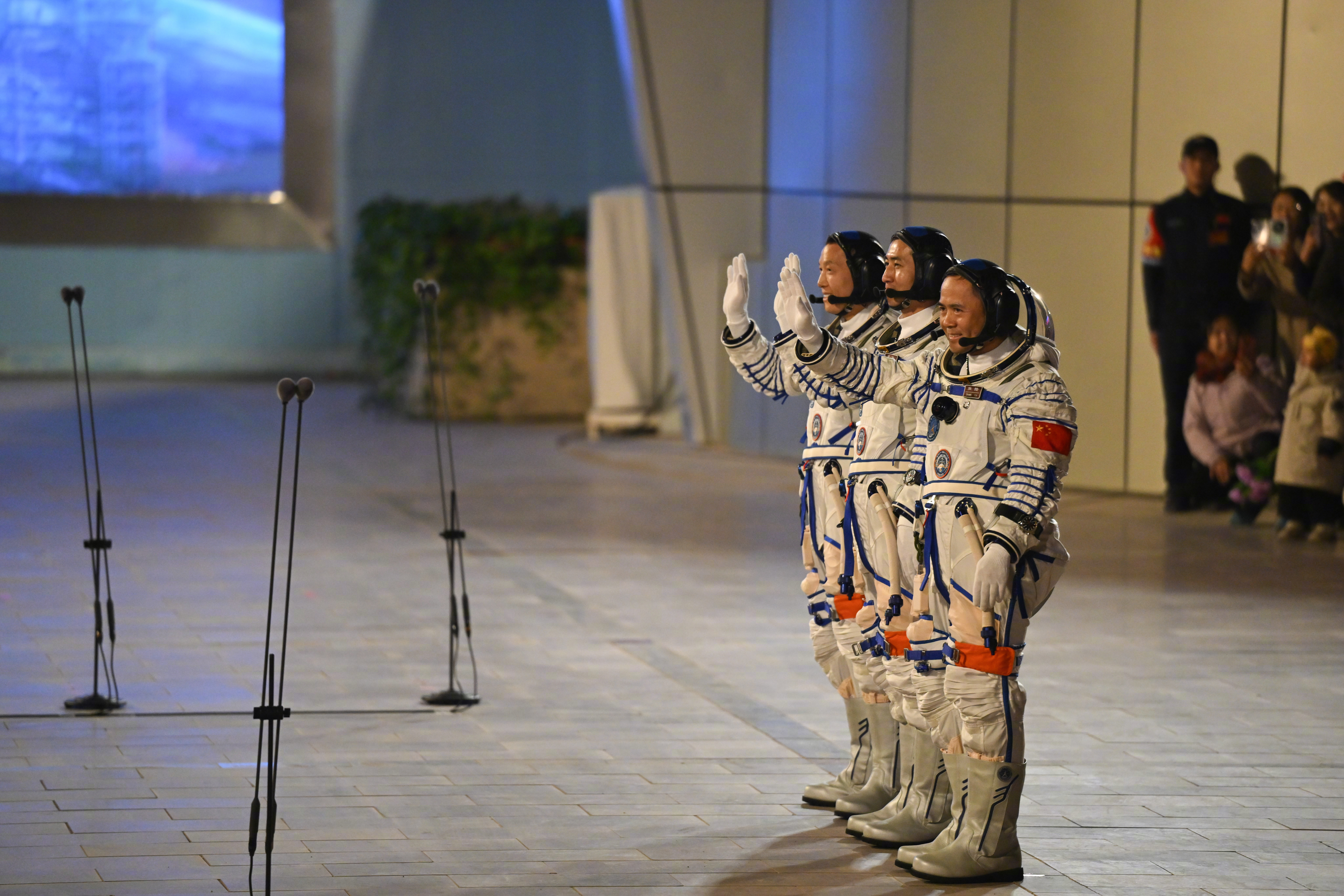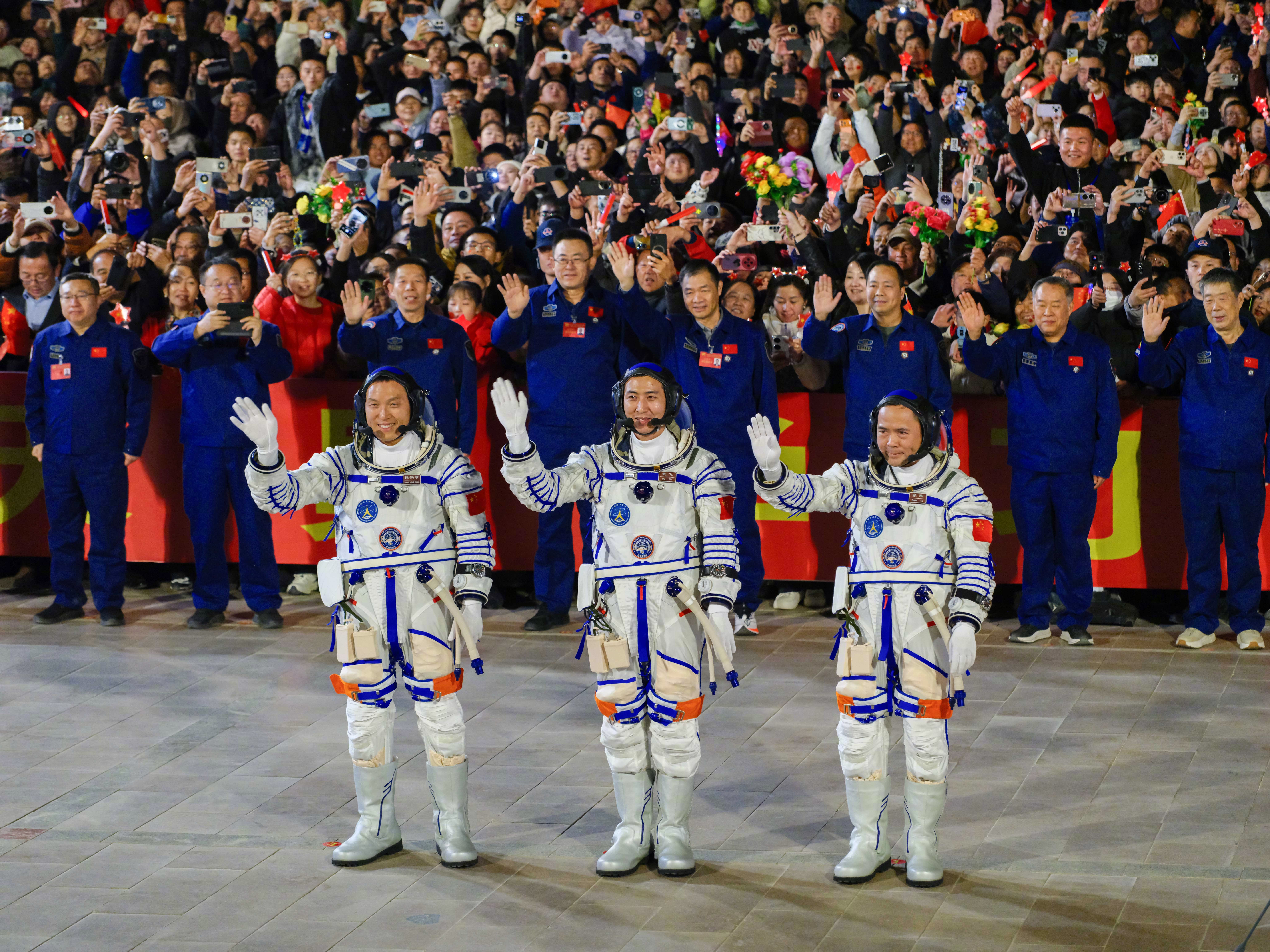 #新华社出图#【高清大图!#神二十一航天员出征仪式#】10月31日晚,神舟二十一号载人飞行任务航天员乘组出征仪式在酒泉卫星发射中心问天阁圆梦园广场举行。神舟二十一号航天员张陆、武飞、张洪章领命出征,一起祝福!(记者:连振 马金瑞)