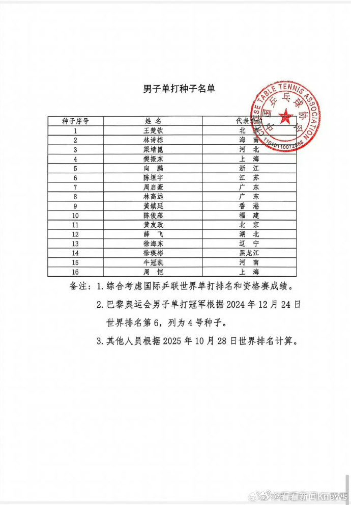 #樊振东全运会男单4号种子# 【#王楚钦全运会1号种子#】10月31日,全运会发布乒乓球男单种子名单:1号种子 2号种子 3号种子 4号种子。