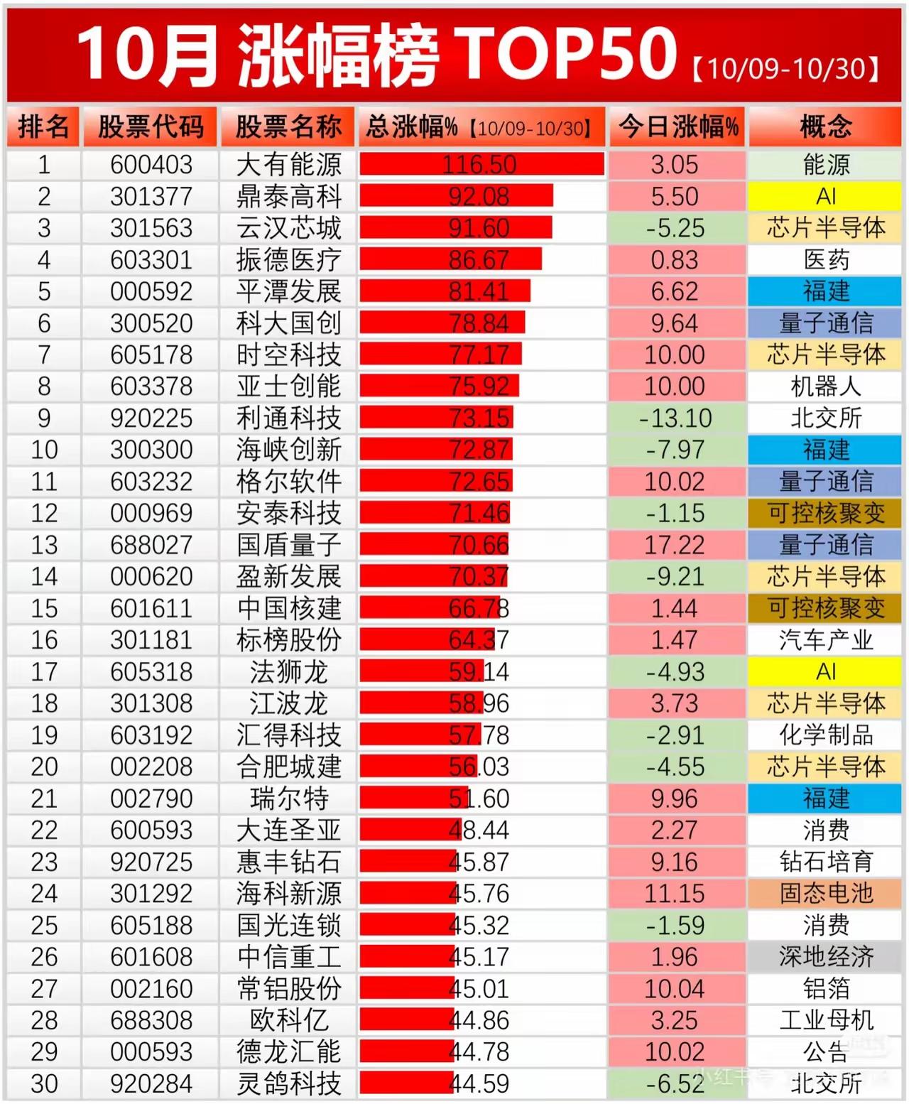 2025年10月9日至10月30日期间的A股涨幅榜TOP50总结: 榜单概览 榜单统计了该时间段内涨幅最高的50只股票。总涨幅最高的股票为大有能源,涨幅达116.50%。榜单涵盖了从排名第1位到第50位的完整信息,包括股票代码、名称、总涨幅、今日涨幅及其所属概念板块。 核心数据亮点 1. 总涨幅前列:排名前列的股票总涨幅均非常可观。除大有能源外,科大国创(92.08%)、海峡创新(91.60%)、格尔软件(86.67%)等股票的总涨幅也超过了80%。 2. 今日涨跌不一:在10月30日当天,个股表现分化。例如,时空科技、天际股份、合富中国等股票今日涨幅达到10%或以上;而云汉芯城、安泰集团等股票今日则出现下跌。 3. 热门概念集中:上榜股票涉及的概念板块多样,其中能源(如大有能源)、AI(如科大国创、四方股份)、芯片半导体(如海峡创新、江波龙)、量子通信(如国盾量子、禾信仪器)、固态电池(如天际股份、大中矿业)、北交所(如富士达、同惠电子)等是出现频率较高的热门主题。