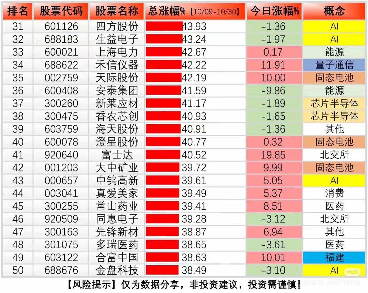 2025年10月9日至10月30日期间的A股涨幅榜TOP50总结: 榜单概览