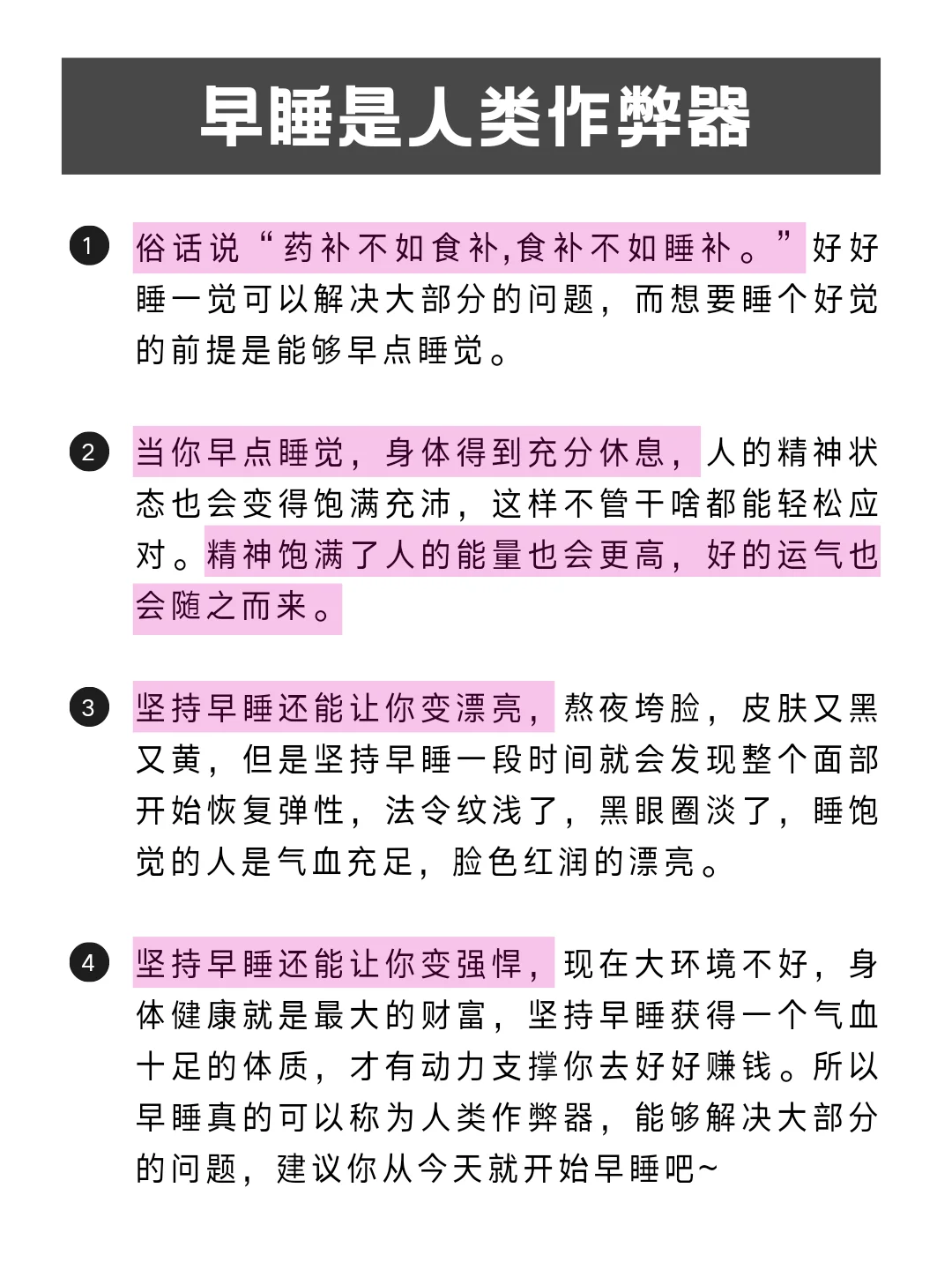 [向右R]坚持早睡还能让你变强悍,现在身体健康就是最大的财富,坚持早睡获得一个气血十足的体质,才有动力支撑你去好好赚钱。所以早睡真的可以称为人类作弊器,能够解决大部分的问题,建议你从今天就开始早睡吧~