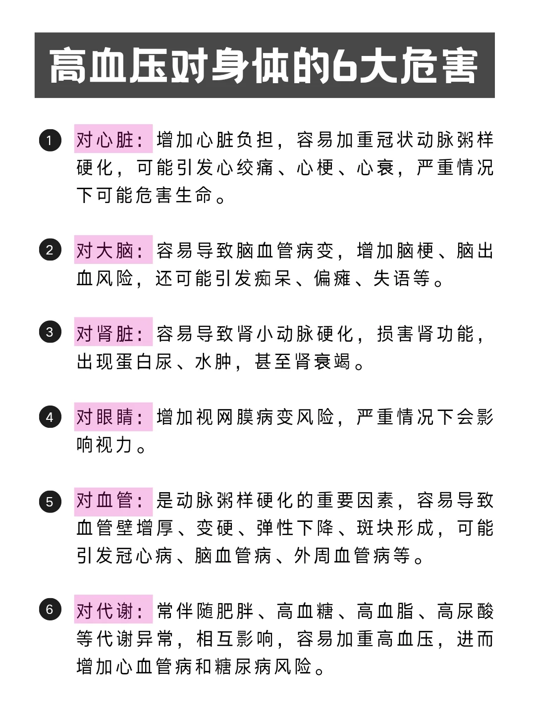 [向右R]再加上高盐饮食、过度劳累、情绪激动、长期久坐、吸烟、喝酒等不良行为,只会让血压越来越高,长期如此就会引发一系列严重健康问题: