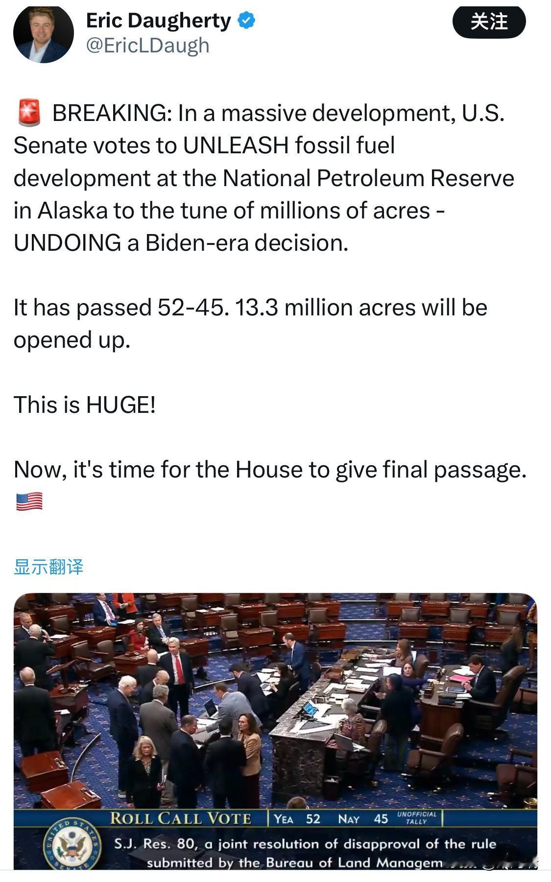 突发新闻:美国参议院投票决定在阿拉斯加国家石油储备区启动数百万英亩的化石燃料开发,这一重大进展推翻了拜登时代的决定。 该提案以52比45的投票结果获得通过。将开放1330万英亩土地。 这太劲爆了! 现在,是时候让众议院进行最终表决了。