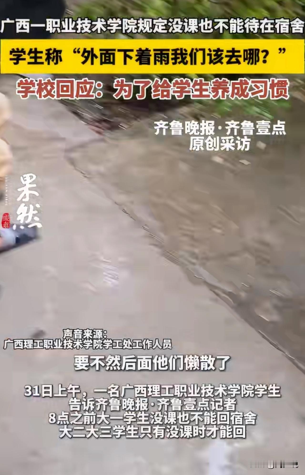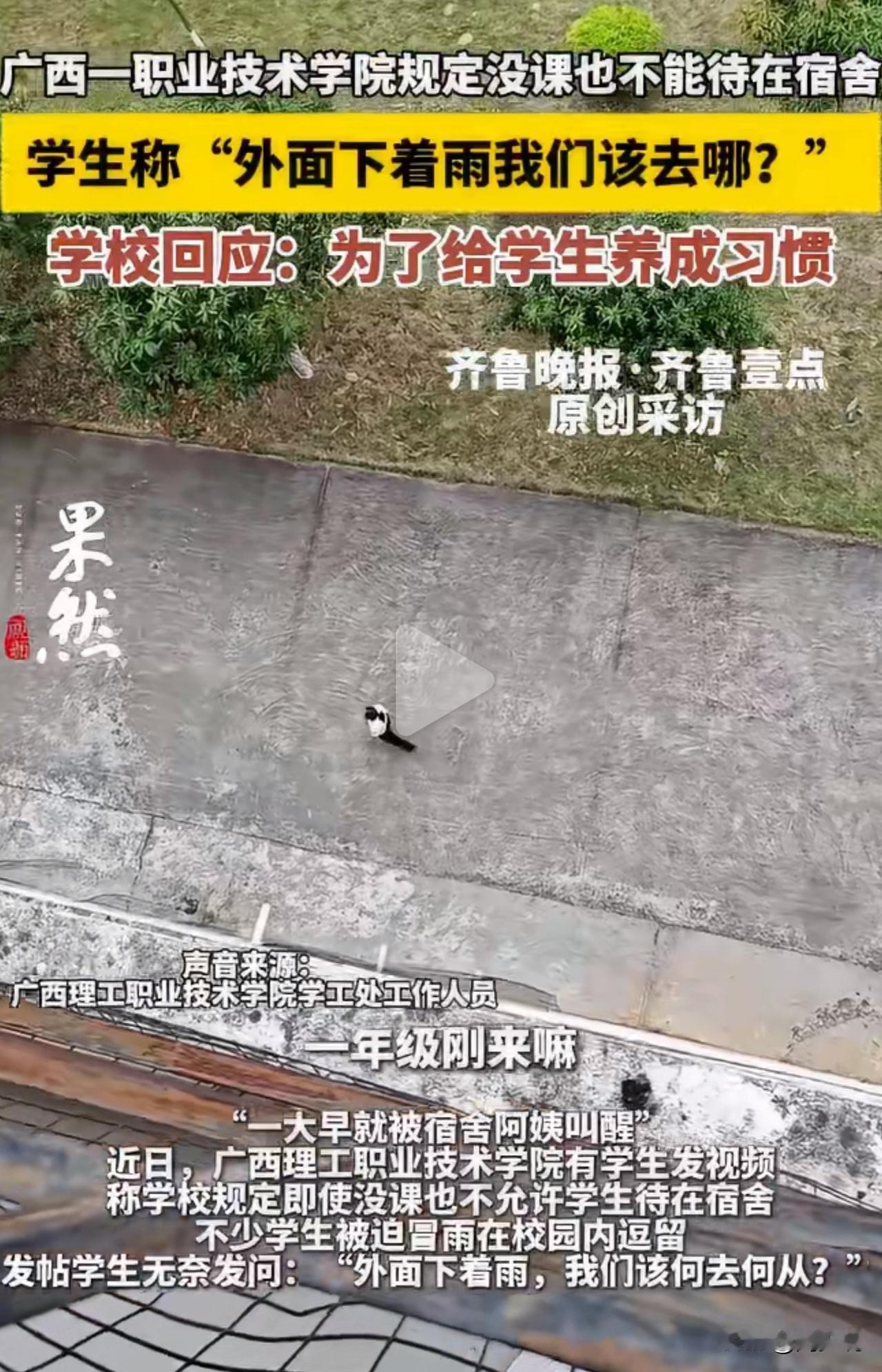 罕见,高校规定没课也不准待宿舍!学生冒雨徘徊发问:我们该何去何从?网友:规矩要灵活,不能一刀切折腾学生! 近日,广西理工职业技术学院学生发视频吐槽,称即使没课,学生也被禁止留在宿舍,不少人被迫冒雨在校园内徘徊,有人甚至搬来凳子坐在室外,无奈发问:“外面下着雨,我们该何去何从?” 据学生透露,大一学生8点前没课也不能回宿舍,大二大三学生没课时需先离开宿舍。 针对此情况,学校学工处工作人员回应,“此规定是为让大一新生养成早起习惯,避免懒散缺课;要求大二大三学生离开则是为督促其锻炼,8点40分后可返回,且仅周一到周五执行。” 此事也引发网友热议,有网友说:“锻炼和早起靠自觉引导,强制驱赶太不合理了”? 也有网友称:“雨天连个避雨的地方都没有,学校只讲管理不讲人情”! 更还有网友表示:“规矩要灵活,不能一刀切折腾学生”。 其实,周少觉得学校督促学生自律的初衷可理解,但管理需兼顾实际情况与人文关怀。强制学生离开宿舍却未提供合理活动保障,尤其雨天让学生露天逗留,既易引发抵触情绪,也违背管理的本质。 真正的自律培养,靠的是科学引导而非生硬规定,这样的“一刀切”做法,显然需要更人性化的调整。这也给其他学校提醒,管理学生不能一刀切,而是要讲究方式方法。 对于该高校规定学生没课也不能待宿舍,大家怎么看呢?#寻美三湘# #长沙新朋友#