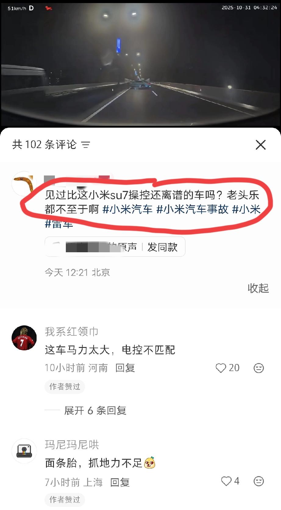 一段某粮酥7的单车事故! 事发时间是凌晨4点多,视频车的速度是90,那猜测酥妻一开始的速度在80左右,当视频车要超过酥妻的时候,酥妻可能不想让对方超过他吧,就提了一点速,不想就这么水灵灵的甩尾,直至最后撞到了护栏上面…… 有没有车主开其他品牌的车,稍微提一点速就这个样子的?有网友归咎于路有点湿滑,我看原因不全是这个吧?